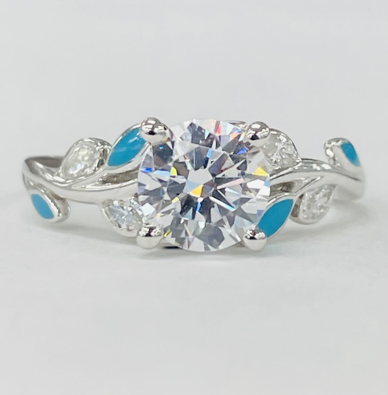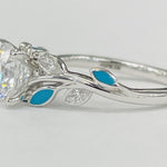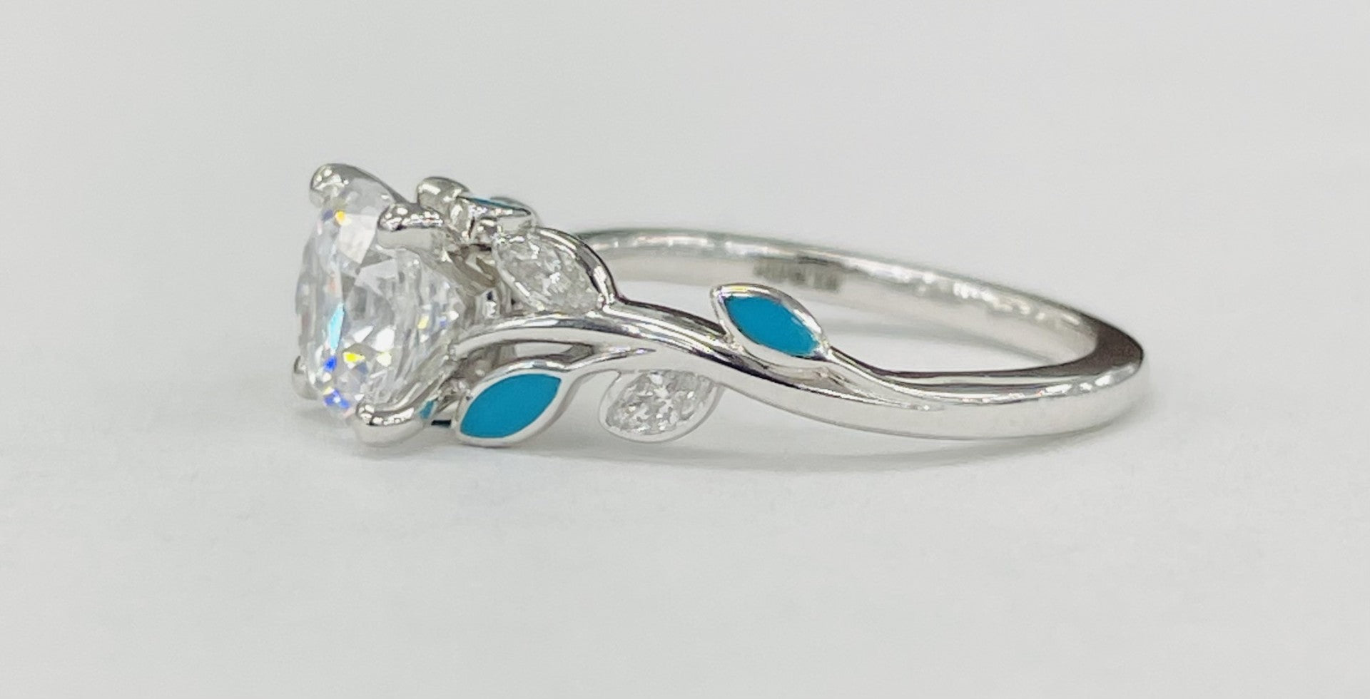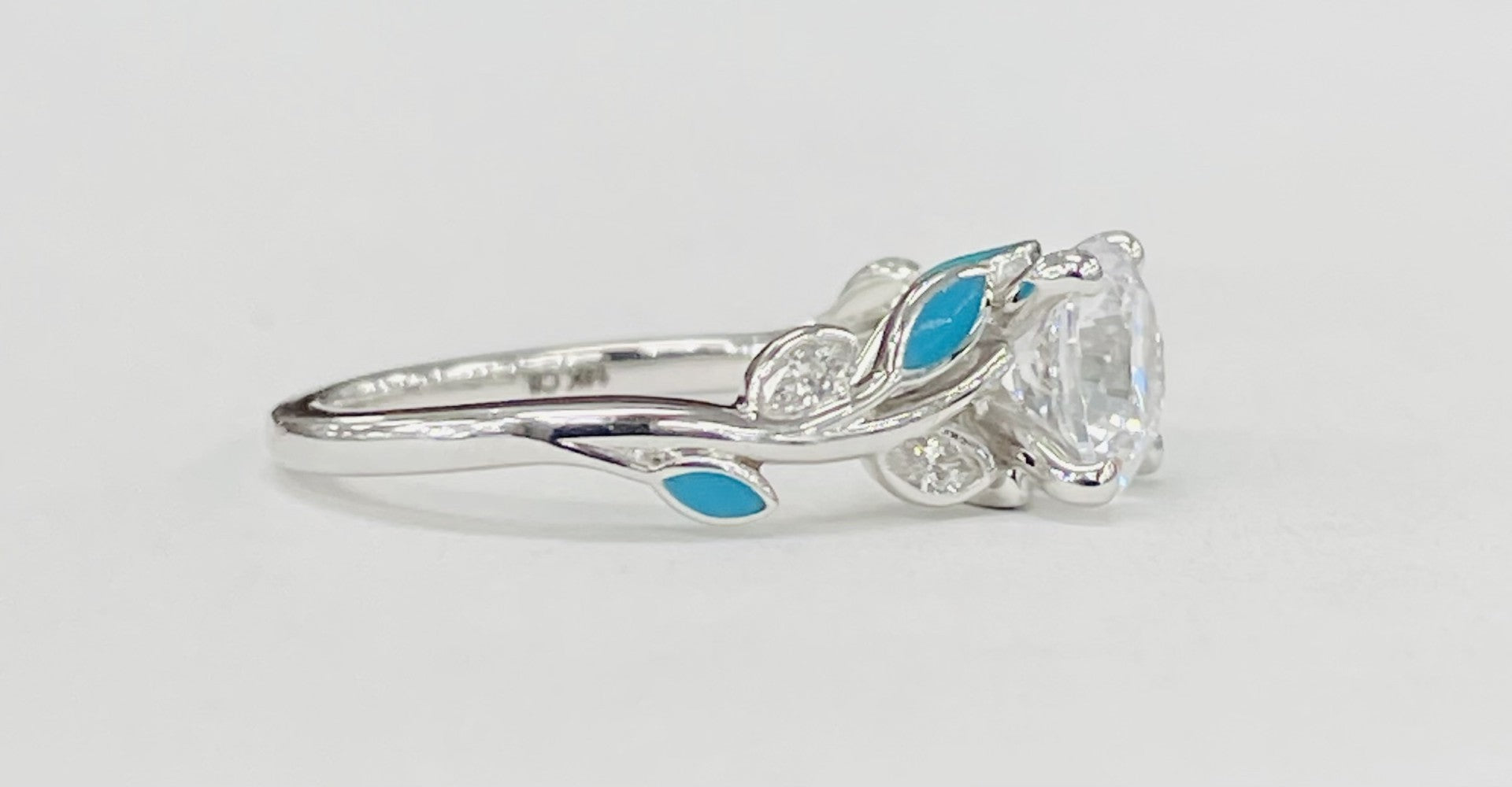 - Style: Floral engagement ring with turquoise ceramic petals