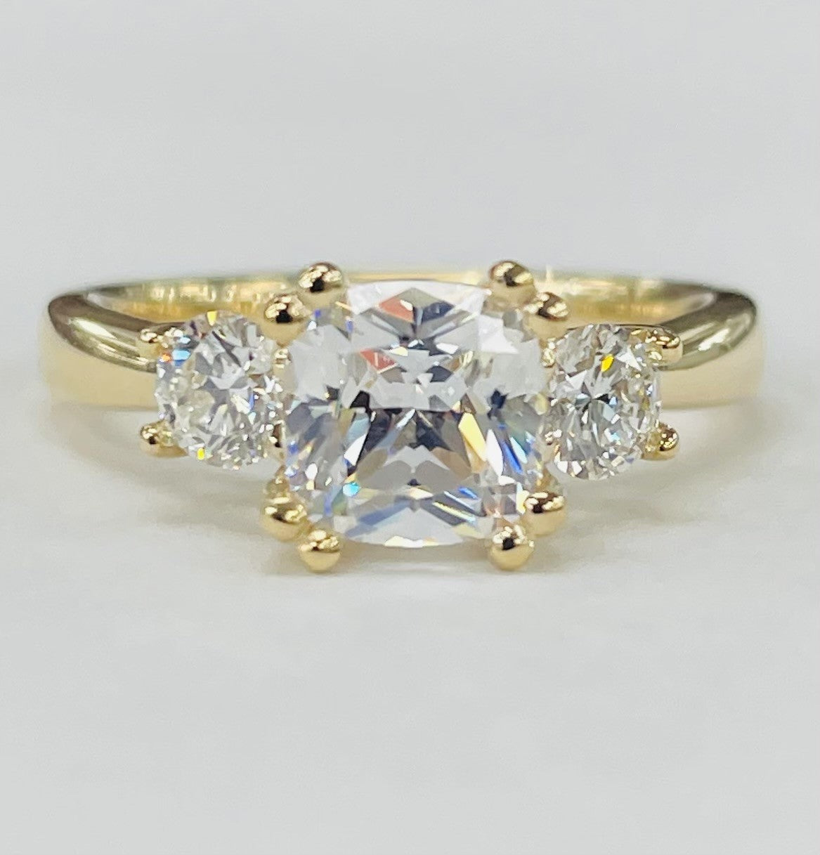 This Three Stone Diamond Engagement Ring makes a spectacular statement. Round diamonds flanking the center stone create a dramatic display of sparkle and fire. The high polished band reflects the radiance of the diamonds.