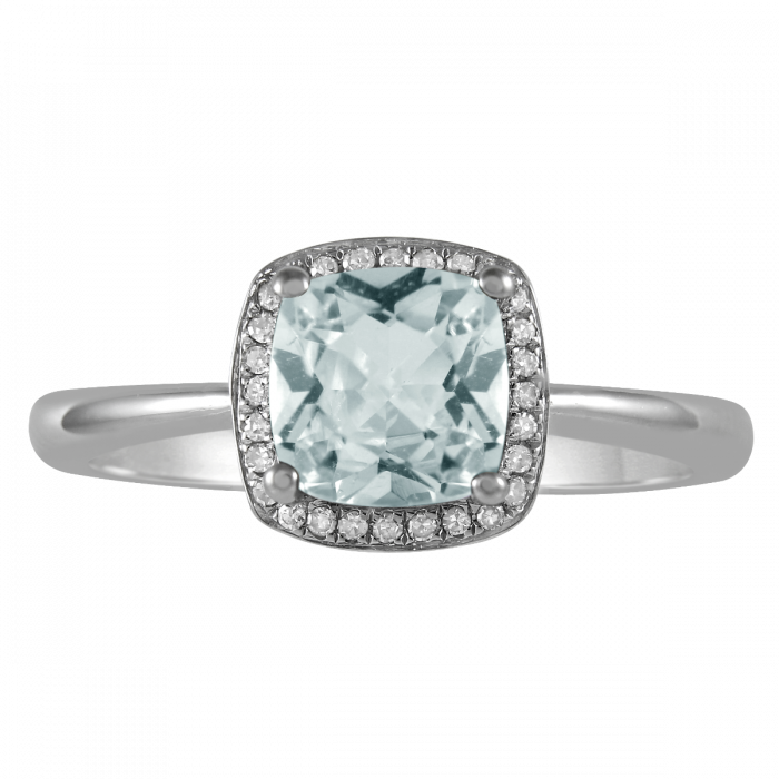 Our birthstone collection rings features stunning checkered center stones surround by beautiful round brilliant diamonds. Made out of luxurious white gold to accent the stones this is the perfect ring for any march baby.