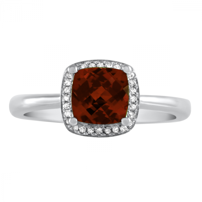 Our birthstone collection rings features stunning checkered center stones surround by beautiful round brilliant diamonds. Made out of luxurious white gold to accent the stones this is the perfect ring for any january baby.