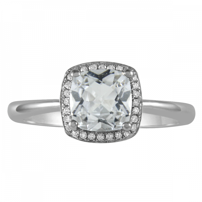Our birthstone collection rings features stunning checkered center stones surround by beautiful round brilliant diamonds. Made out of luxurious white gold to accent the stones this is the perfect ring for any april baby.