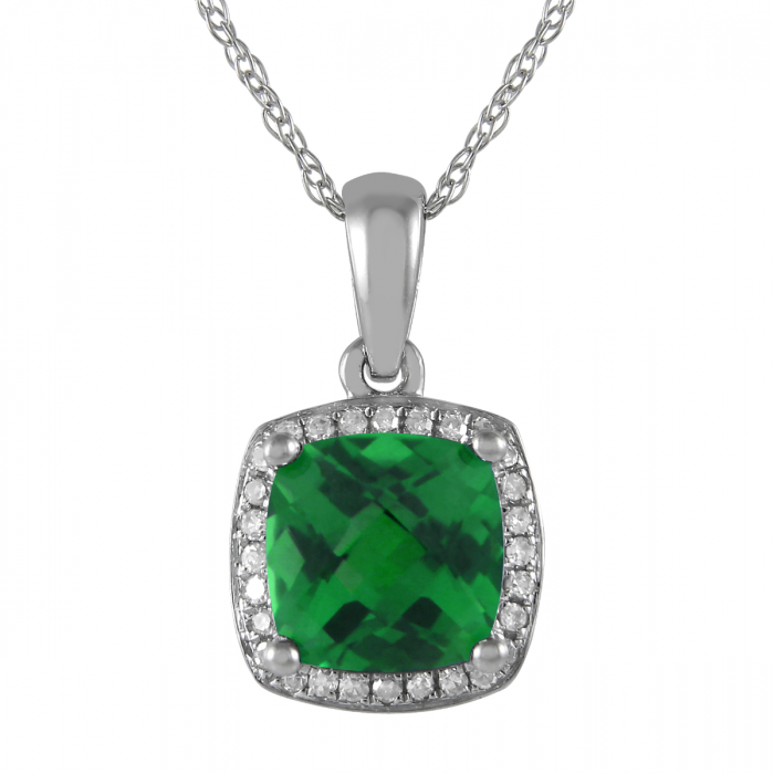 Our birthstone collection necklaces features stunning checkered center stones surround by beautiful round brilliant diamonds. Made out of luxurious white gold to accent the stones this is the perfect necklace for any may baby.