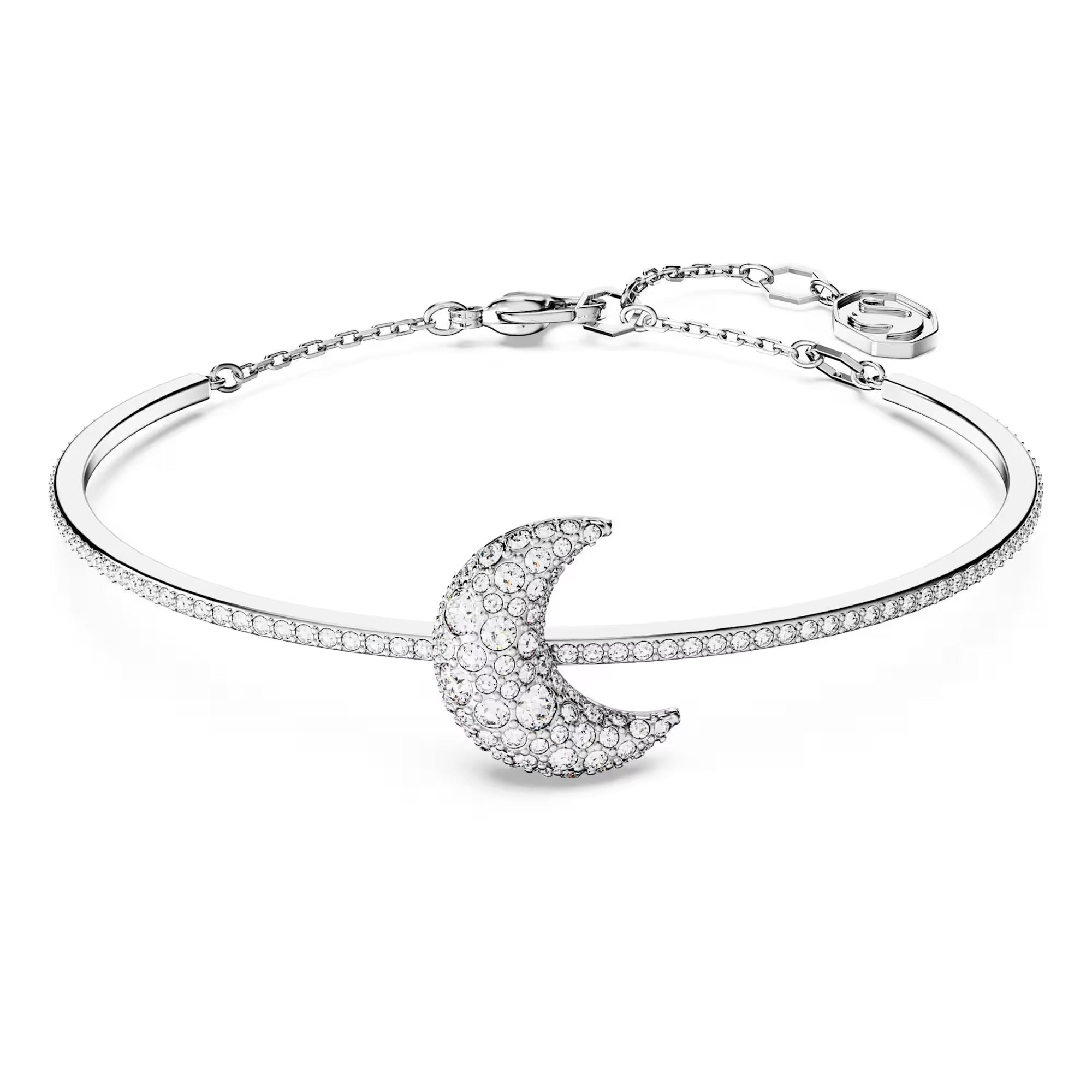 Wear the magic of the night sky on your wrist. This rhodium plated bangle features a crystallized bangle with a central crescent moon motif, beautifully embellished in five different sizes of crystals for a refined pavé effect. The design is completed with a lobster closure and is a perfect moongazing choice to make your style shine.