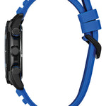 Bold and sporty, this new Brycen chronograph is ready for any adventure. The watch wears boldly at 44.8mm, with a black-tone stainless steel case accented with blue details on its racing-style pushers. A rotating 60-minute bezel adds to its functionality, while a durable blue silicone strap secures the timepiece to the wrist.