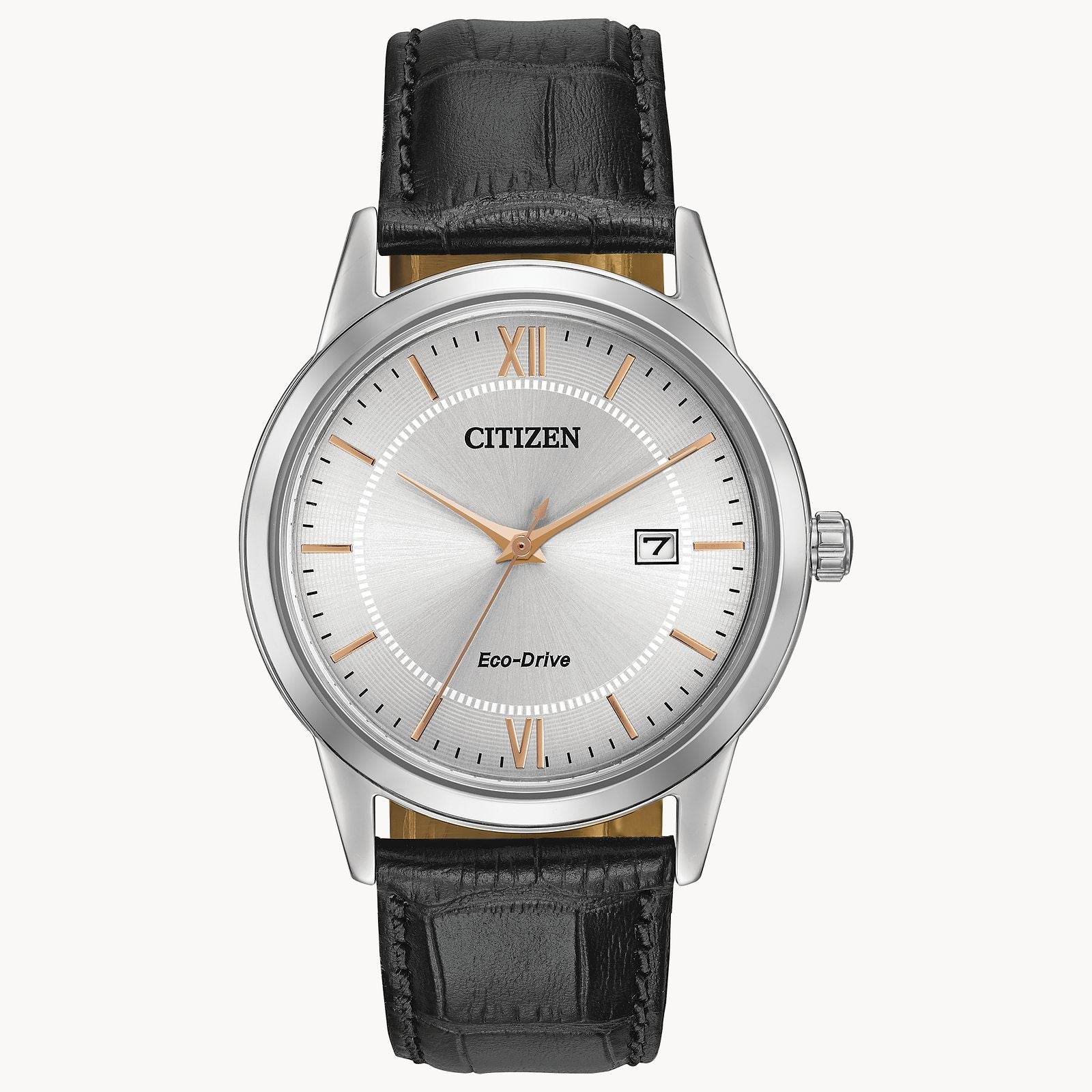 Keep it simple with the classic lines and rich leather strap of these men's CITIZEN® strap watches. Featured with stainless steel case, black leather strap, metallic silver dial with rose gold accents and date. Featuring our Eco-Drive technology – powered by light, any light. Never needs a battery. Caliber number J810.