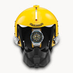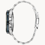 The mission of the Blue Angels is to showcase the pride and professionalism of the U.S. Navy and Marine Corps through their expert precision and dedication to excellence and service. Citizen is proud to present the latest Promaster Blue Angels Air Skyhawk men’s watch in a Special Edition box set. With only 9,999 pieces made worldwide, this exceptional timepiece has a silver-tone stainless steel case with a blue dial and blue ion-plated bezel encased in sapphire crystal. It features atomic time clock synchronization for superior accuracy, time adjustment available in 43 world cities, 1/100 second chronograph measures up to 24 hours, perpetual calendar, GMT dual time (second time zone), 2 alarms, 99-minute countdown timer, digital backlight display, Universal Coordinated Time (UTC) display, and a power reserve indicator. The silver-tone stainless steel bracelet band fastens with a fold over clasp with hidden push buttons. The Blue Angel's insignia is replicated on the case back. This distinctive sports watch utilizes our Eco-Drive technology that’s sustainably powered by light and never needs a battery, and is water resistant up to 200 meters. Reach a higher altitude in style and pay tribute to the elite Blue Angels with this high-performance timepiece. The special edition version of the Blue Angels comes with a yellow helmet case and is the ultimate collector’s box set to own.