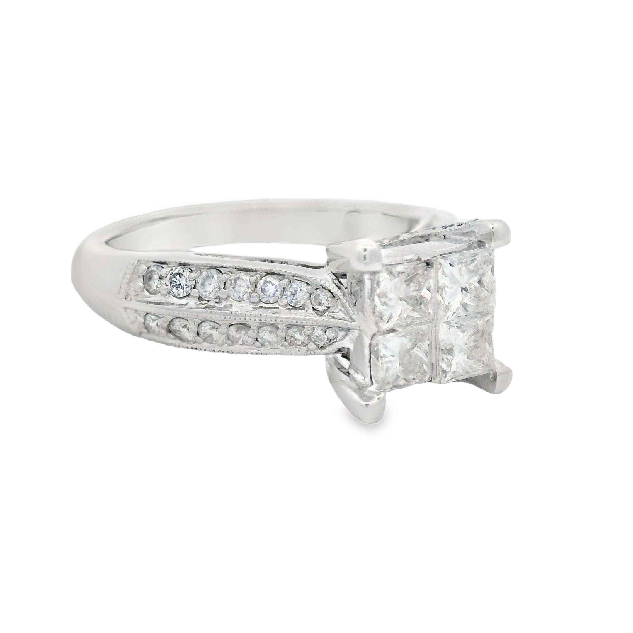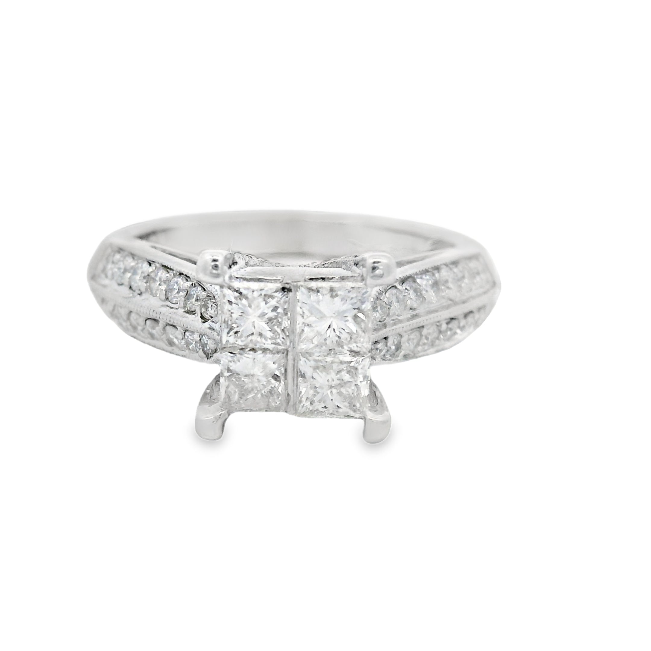 Elegance at its finest! This breathaking quad engagement rings not only features four princess cuts in the center, but al accented by a double row of round brilliant cuts on the shank. With a hint of even more sparkle with diamonds on both sides of the head. Truly a remarkable ring for a even more remarkable women!
