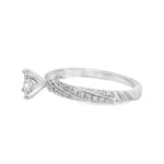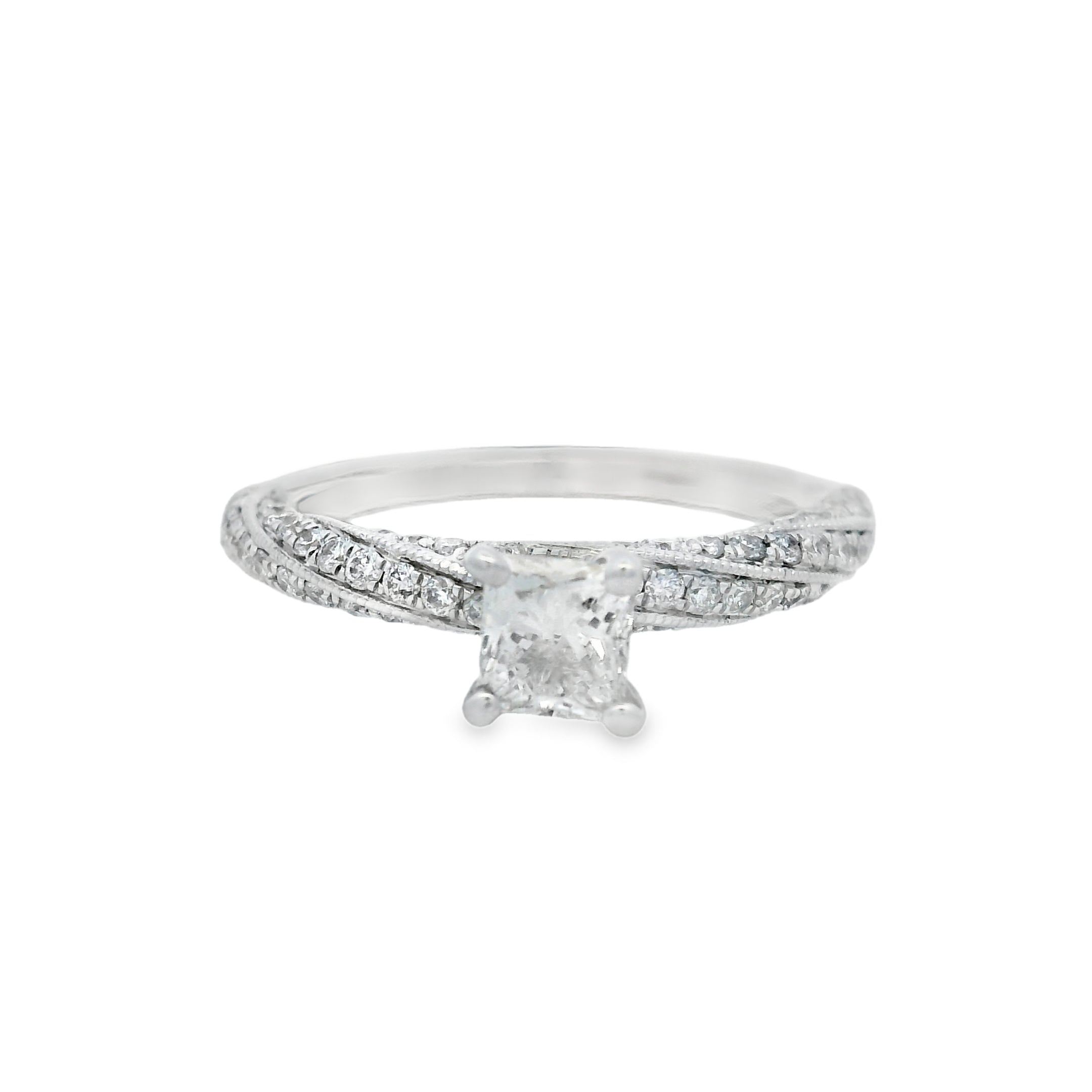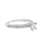 This stunning engagement ring features a brilliant princess-cut diamond at its center, surrounded by a delicate band adorned with sparkling smaller diamonds. Crafted from high-quality white gold, it radiates elegance and sophistication, making it the perfect symbol of love and commitment.