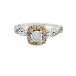 This stunning engagement ring features a brilliant round diamond at its center, surrounded by a halo of smaller sparkling stones. The intricate design combines both white and rose gold, creating a unique and romantic look. Perfect for making a memorable proposal or celebrating a special occasion.