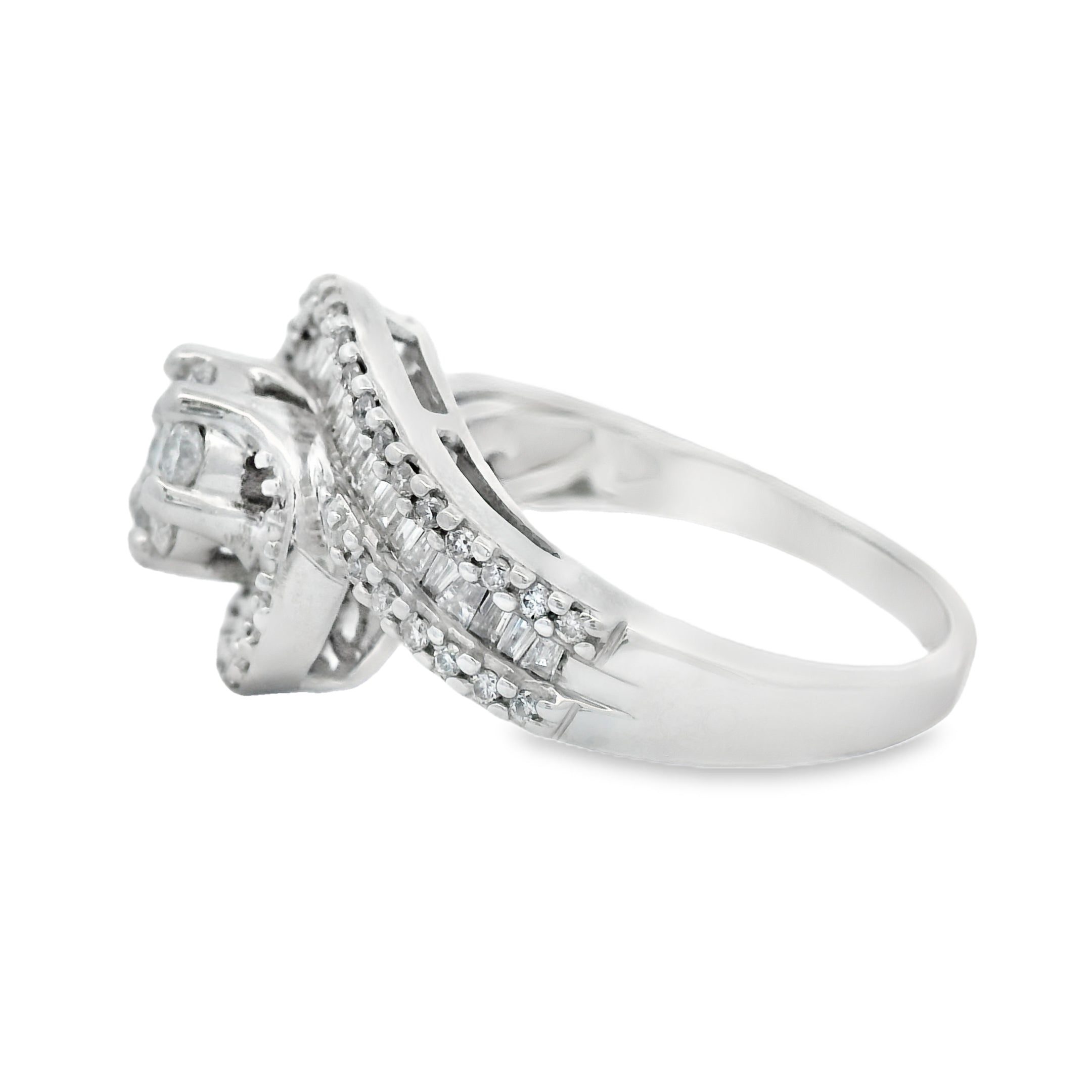 Alot of bling and style! Made out of white gold, this ring features a plethra of stunning round brilliant and baghuette diamonds totaling 2CTW! With a modern twist design, floral composite center, and even more round brilliant diamonds to accent the band, this ring is a show stopper!