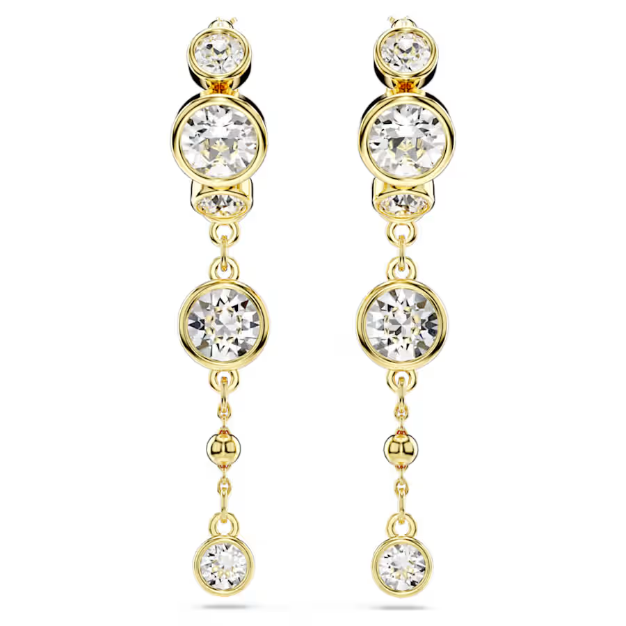 Made for light-catching movement, these pierced earrings are a striking way to elevate any outfit. Each gold-tone plated piece features a mini hoop with a removeable dangling chain, embellished all over with round-cut crystals in a puffy bezel setting and a shiny metal droplet. A versatile choice for those who love to stand out from the crowd.