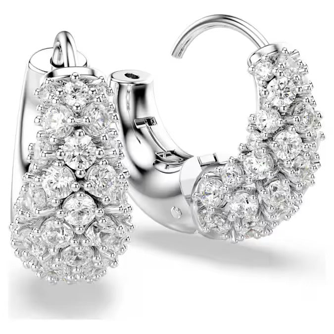 Delicate yet radiant, these shimmering earrings are rhodium plated and feature a stunning decoration of clear Swarovski Zirconia, set in place using the chatonnage technique. An additional spring plate mechanism makes them particularly easy to wear. Combine these earrings with a wondrous Sublima pendant or a ring to infuse your entire look with light.