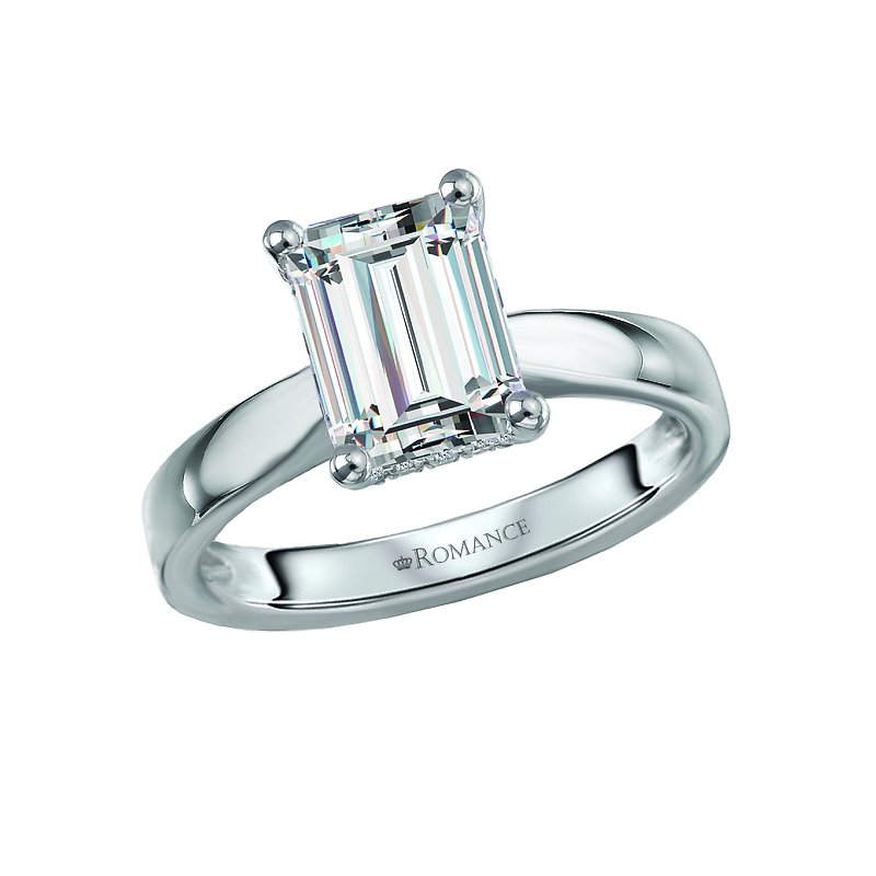 Elevate your proposal with the Romance 160236-EM200 Hidden Halo Semi-Mount Engagement Ring. Crafted in luminous 14K white gold, this elegant setting is designed to hold an 8.5 x 6mm emerald-cut center stone of your choice. A delicate hidden halo of round brilliant diamonds sparkles beneath the center, adding a subtle touch of brilliance from every angle. With its clean lines and modern silhouette, this ring is perfect for those who appreciate understated luxury and timeless design.