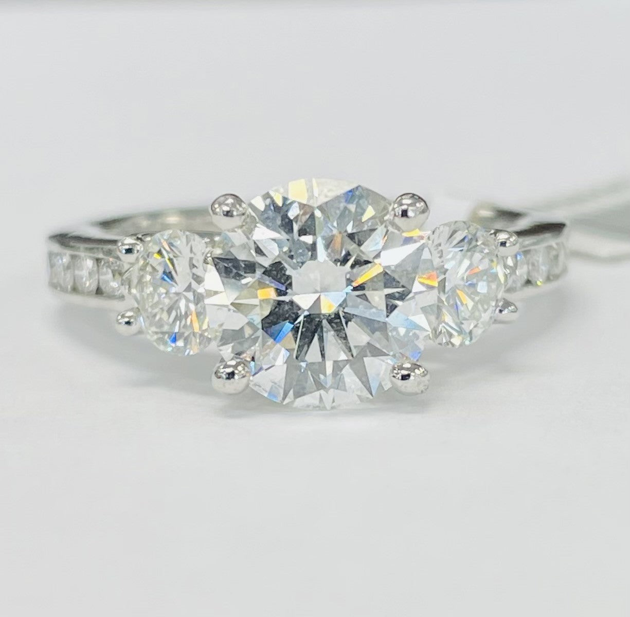 A true wow and statement piece. This out of this world ring features a 2.19CT VS double certified round brilliant diamond in the center. With huge round brilliant diamonds on the sides to complete the look and channel set diamonds to accent, this ring is truly one of a kind. Made for luxury and comfort this ring is made out of Platinum for ultimate protection.