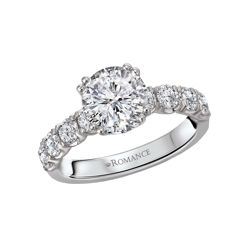14kt white gold semi-mount engagement ring with 8 round diamonds lining the band on either side of a center setting that will accommodate an 8.2mm round diamond. (D 3/4 carat total weight)