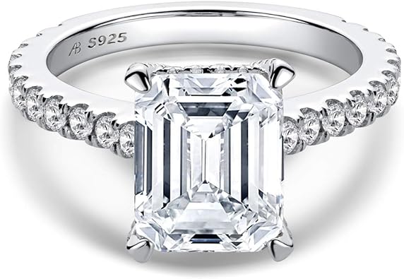 Quality - 925 sterling silver platinum plated, paved with AAA+ clear sparkling cubic zirconia stones,hypoallergenic and nickel free, safe for sensitive skins.Ring Size :5-8. Band width: 2.1mm. Thickness: 1.9mm. Main Stone: 3 carats emerald cut clear cubic zirconia (8x10mm). Metal Weight: About 3.7g.