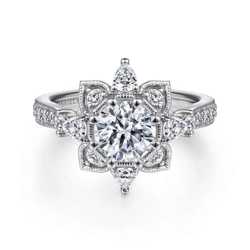 Gabriel & Co. Alexandria ER15783R4W44JJ – 14K White Gold Floral Halo Round Diamond Engagement Ring