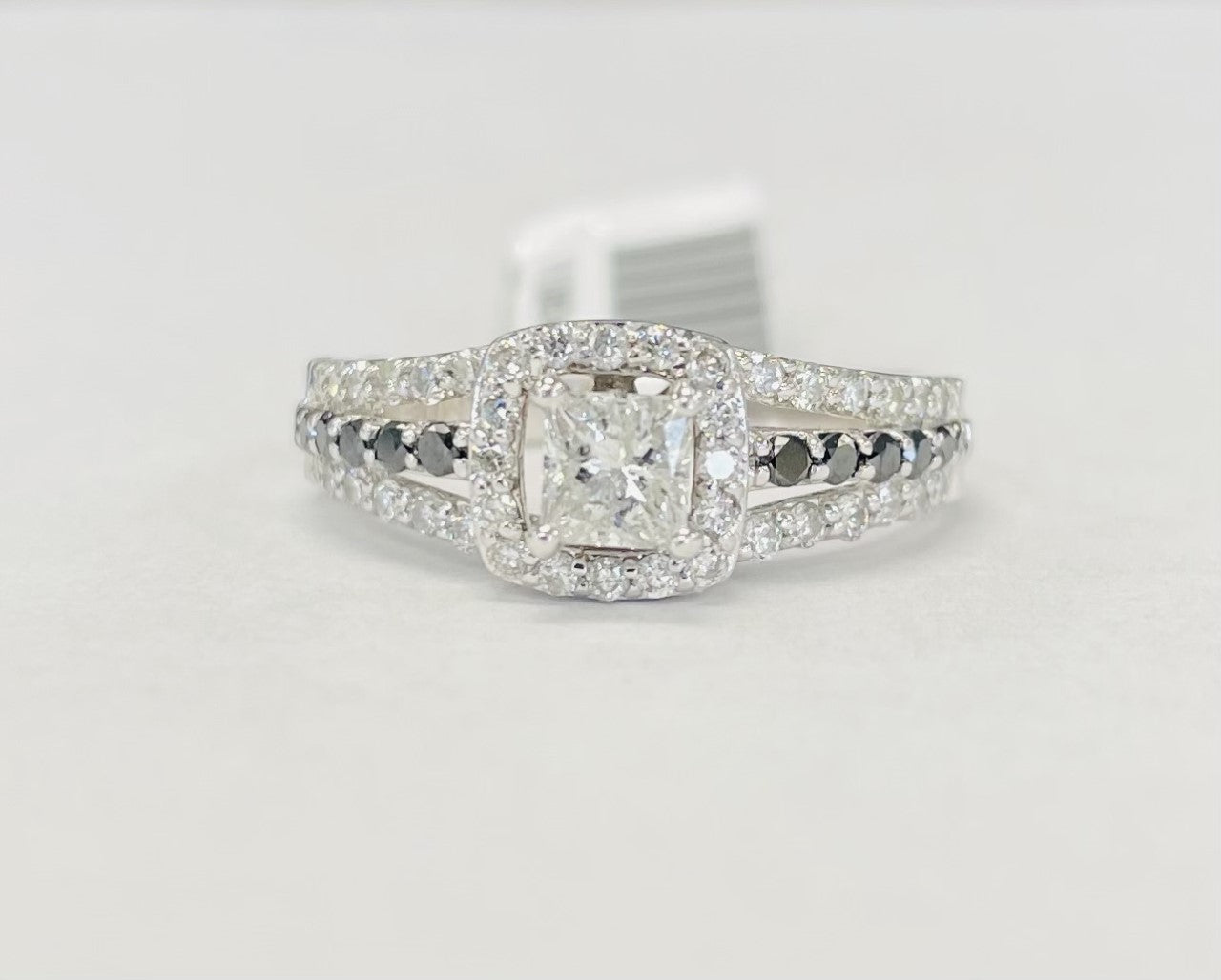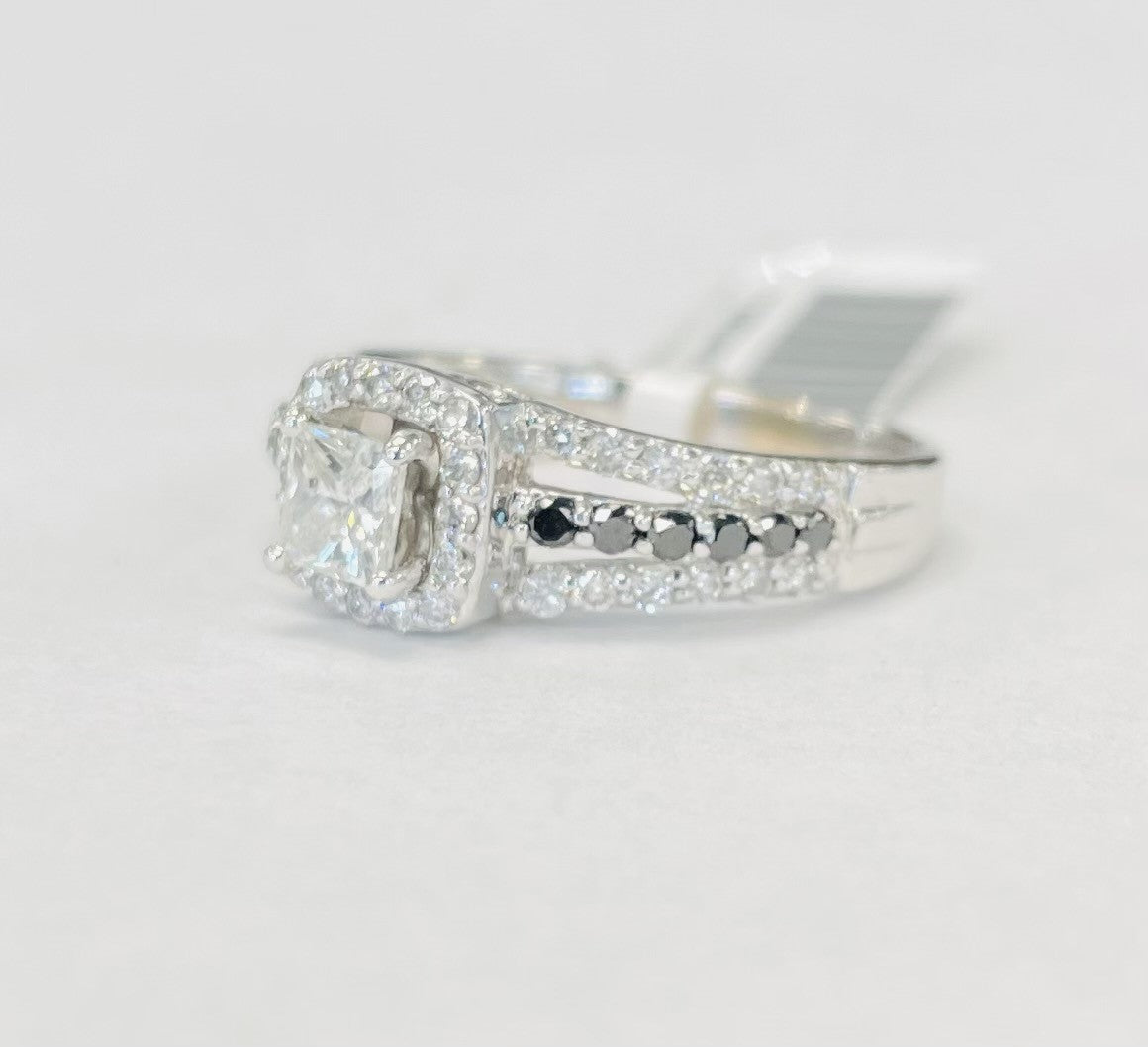 This stunning engagement ring not only shows contrast but aslo beauty. Featuring a beautiful princess cut with a halo to accent. Surround by white and black round brilliant diamonds this ring is absoutly beautiful. With just a dash of black diamonds this ring truly stands.