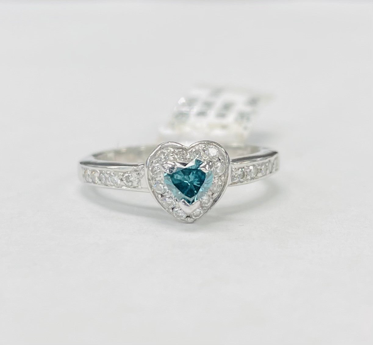 Our love is as deep as the ocean. This is beautiful meaning of this stunning heart halo engagement ring. Featuring a heart blue diamond in the center and accented by a white diamond halo with diamonds down the sides. A true statement of love from you to your significant other.