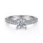 The Gabriel & Co. Carita ER15773R4W44JJ engagement ring is a timeless round diamond design crafted in polished 14K white gold. Featuring a brilliant round-cut center diamond set in a secure prong setting, the sleek band is accented with pave-set diamonds for added sparkle. The Carita ring blends classic elegance with modern sophistication, making it a radiant choice for brides who appreciate refined brilliance and enduring romance.