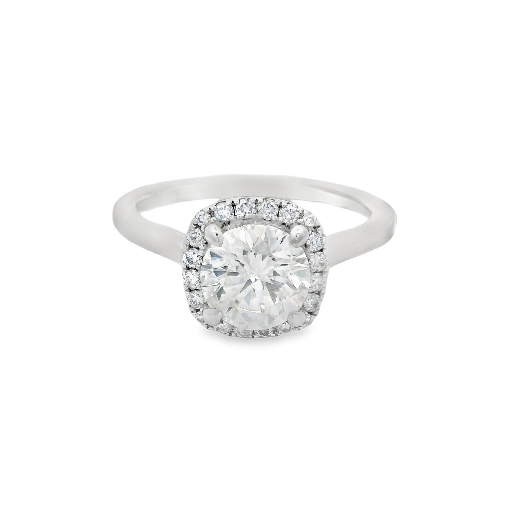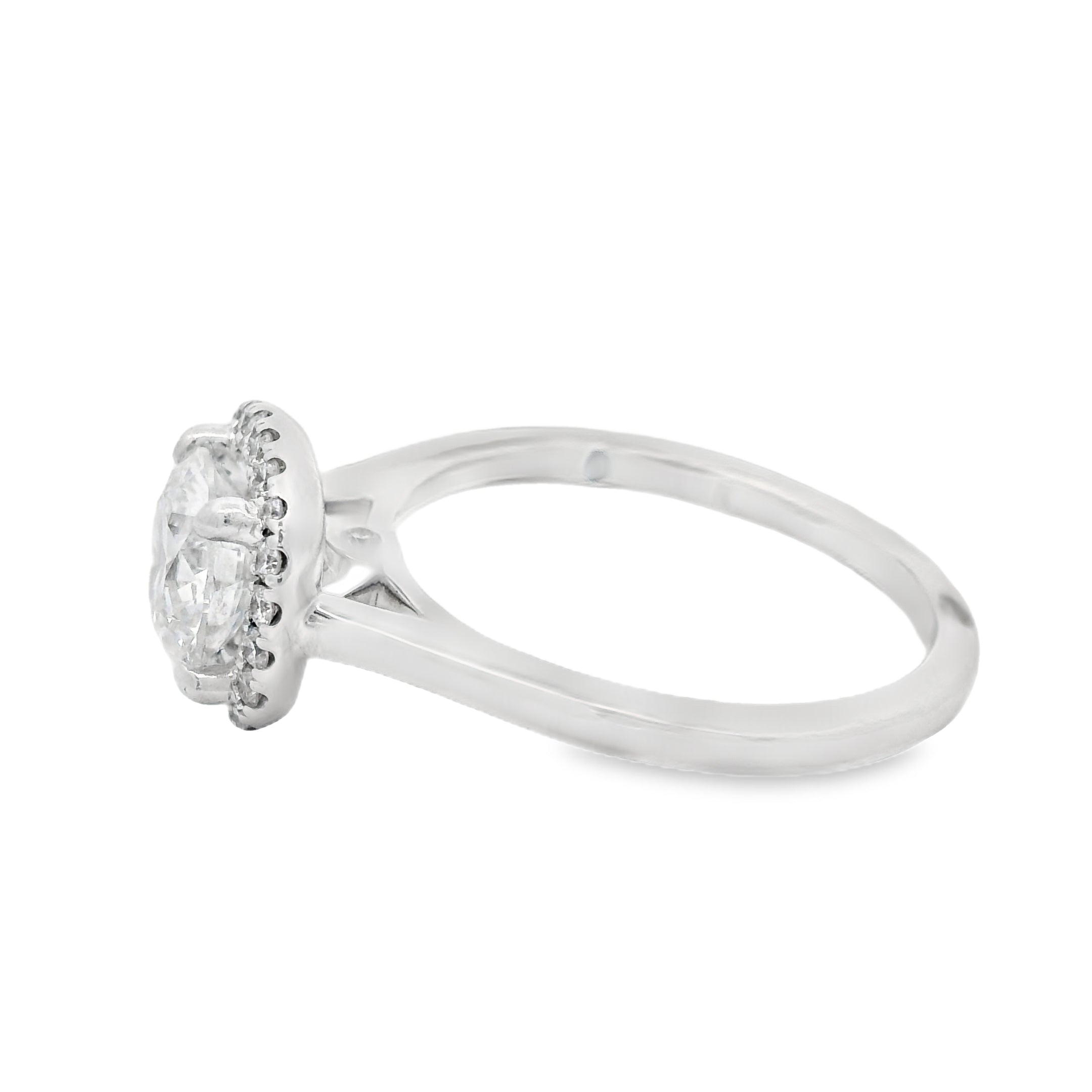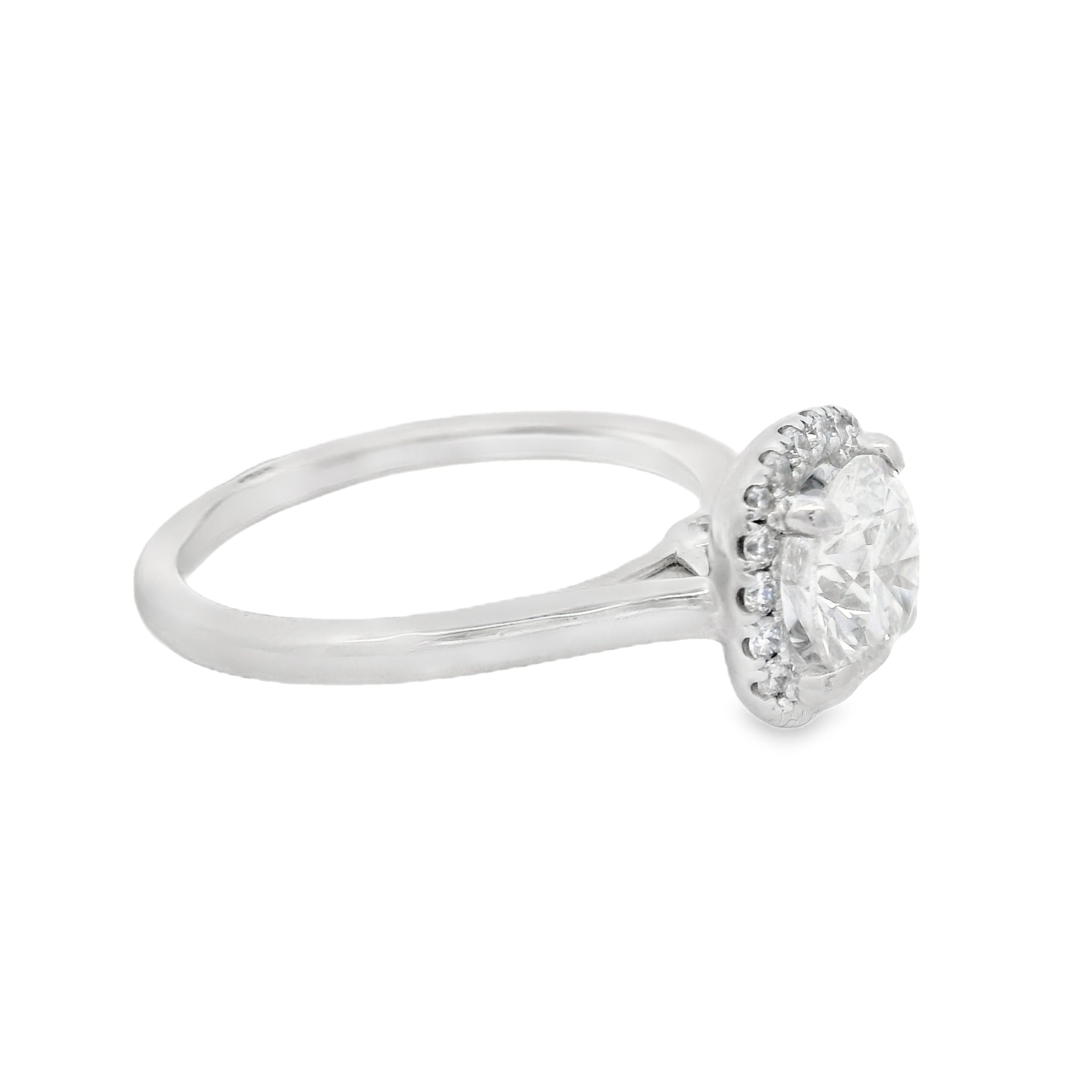 A true everlasting design. This dazzling ring features a massive 1CT GIA certified round brilliant diamond. Accented by smaller round brilliant diamonds in the halo this ring is made to last throughout the ages and be handed down from generation to generation.