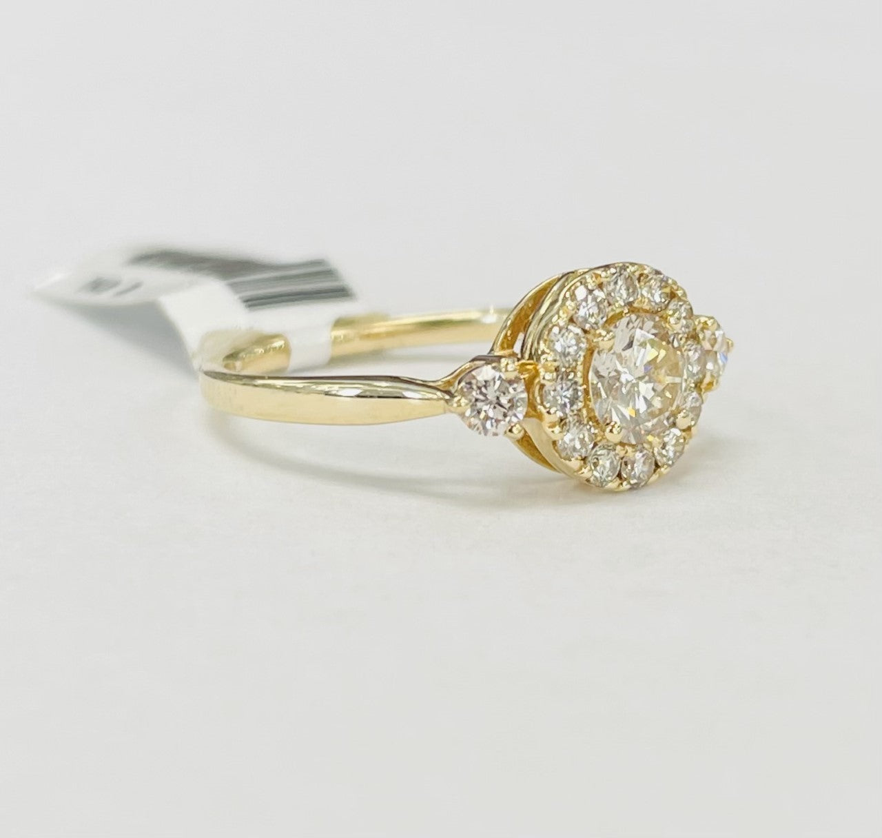 Simple yet impactful. This eyecatching ring is made out of stunning yellow gold to distinguish and show off the diamonds. With a modern style halo with a twist of vintage with the three stone this ring is for sure a showstopper!