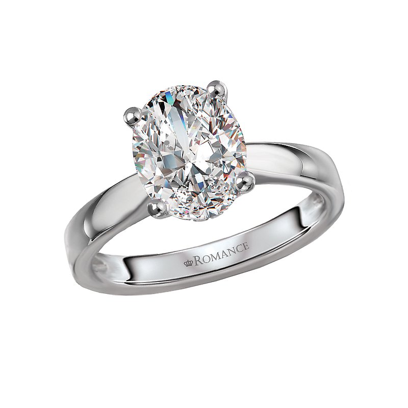 14kt white gold semi-mount engagement ring with a hidden halo of round diamonds under a center setting that will accommodate a 10x7mm oval shaped diamond. (D .08 carat total weight)