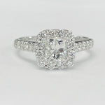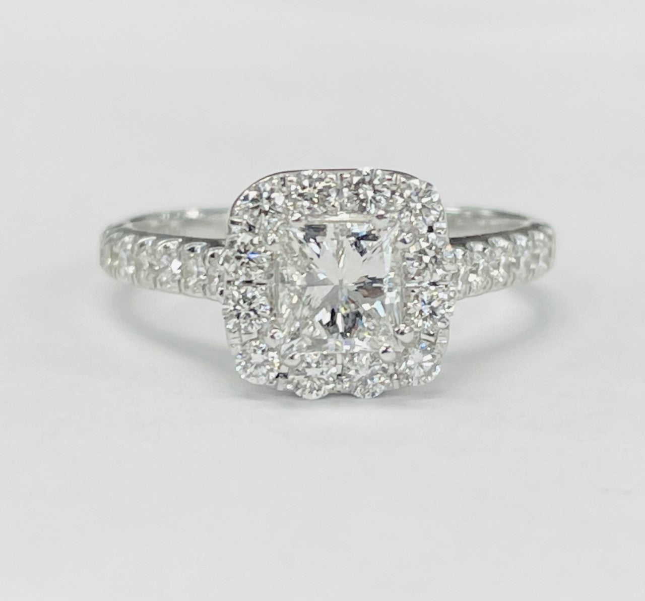From the main deisgner himself Neil Lane comes this stunning ring. Made out of white gold, this ring features a large princess cut center diamond with a stunning cushion halo to accent. With prong set diamonds going down the sides this ring sparkles and shows so much style with also being so simple.