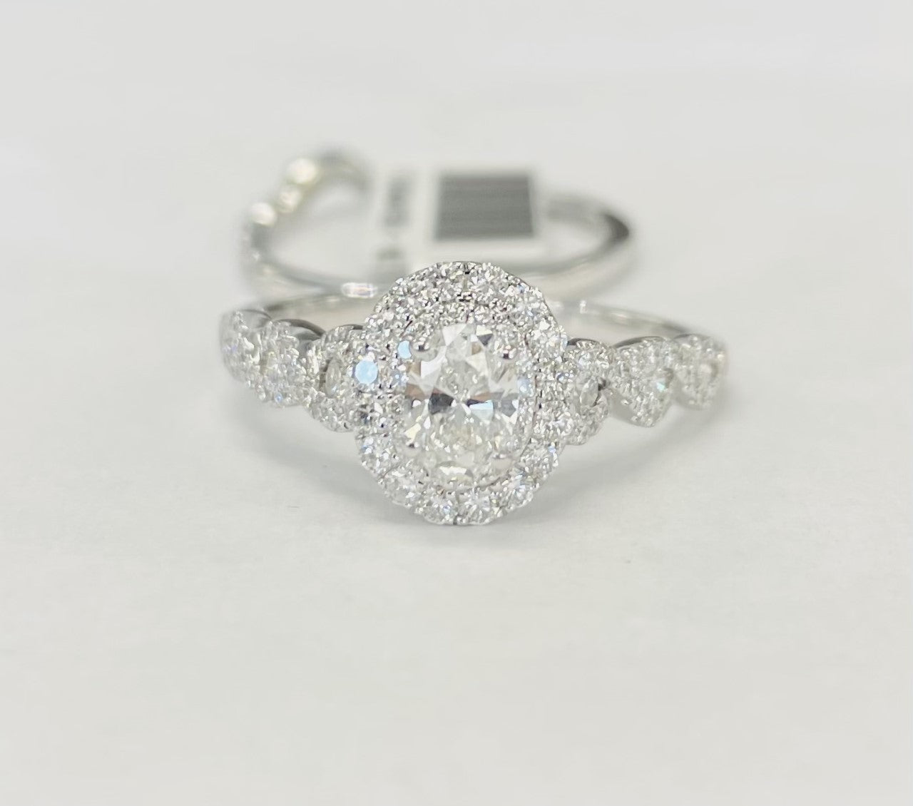 From the main designer Neil Lane comes this stunning double halo oval wedding set. Featuring a 1/2CT oval center diamond this ring is a stunner. With a twist infinty diamond shank to accent this beatuiful halo, it just takes the ring to another level. With a wedding band to match this breathtaking set will leave her speechless and joyus.