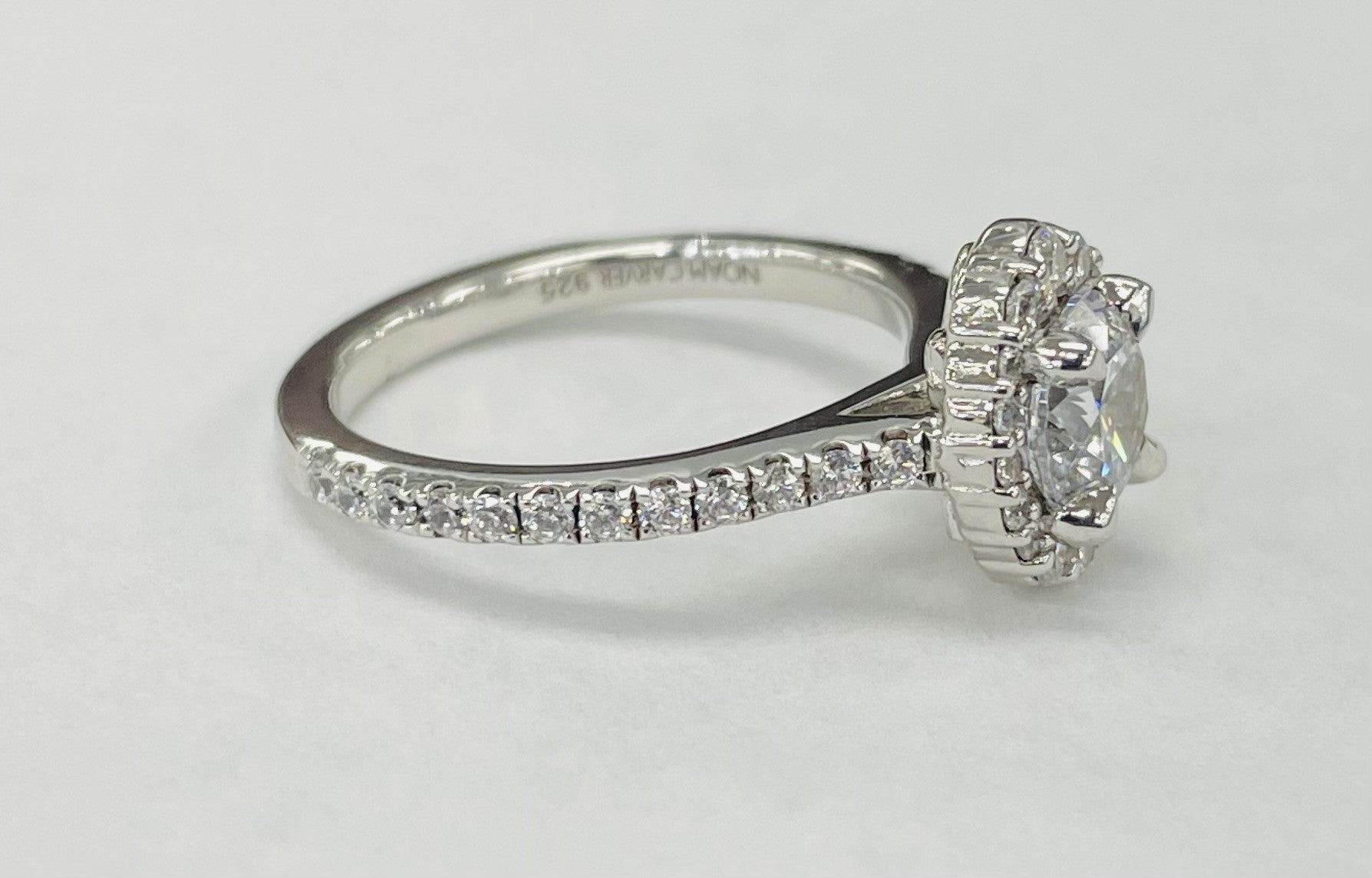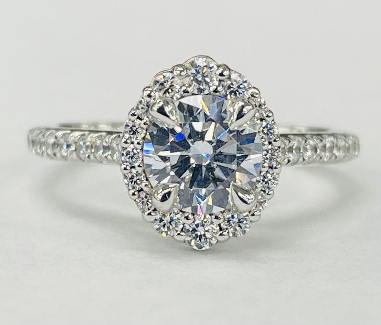 - Accent Stones: ~0.51–0.52 ct round brilliant diamonds (halo + shank)