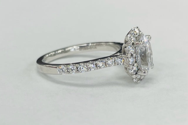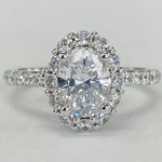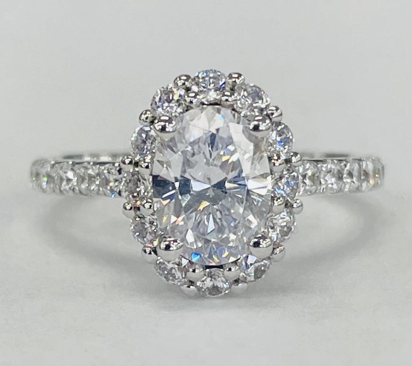 A setting that brings even more bling. Made out of white gold this oval setting features a larger round brilliant diamonds. Accented by even more diamonds down the shank to add more sparkle and brilliance. A setting that can truthfully be seen from across a room and shows the true meaning of love.