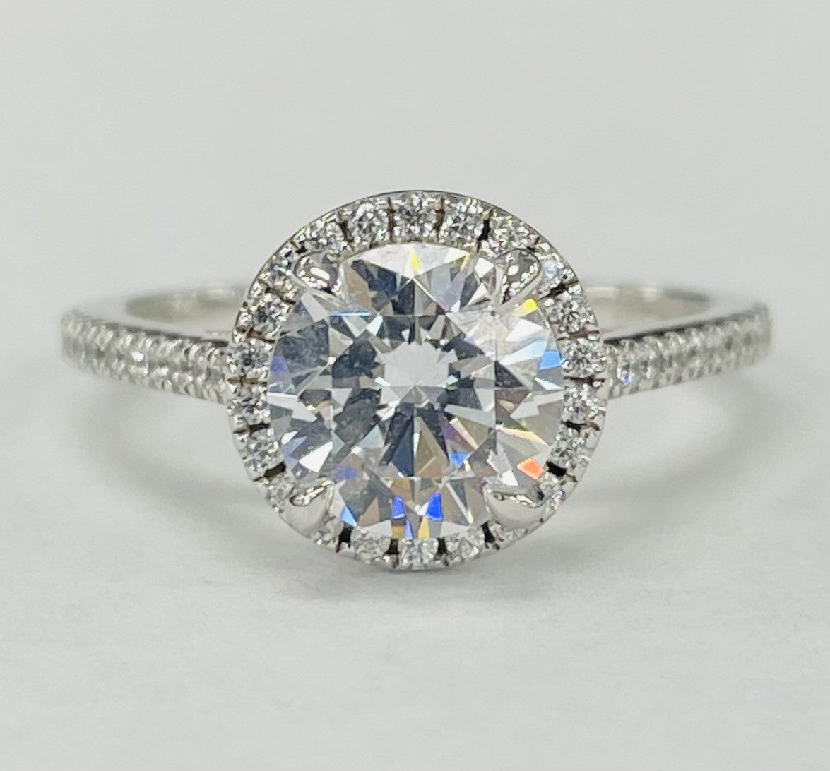 A modern classic. Made out of white gold this setting features a modern micro pave halo. Accented by round brilliant diamonds down the side of the shank and the side of the halo.