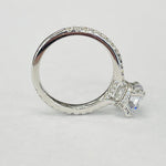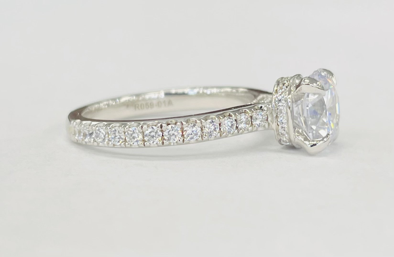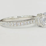 A magnicient setting with a mdoern twist. Made out of white gold this modern ring features a four claw prong head. Accented by a bigger round brilliant diamonds down the side and even more diamonds underneath on head and even a hidden halo! This ring is made to sparkle from every angle and gives that wow factor.
