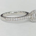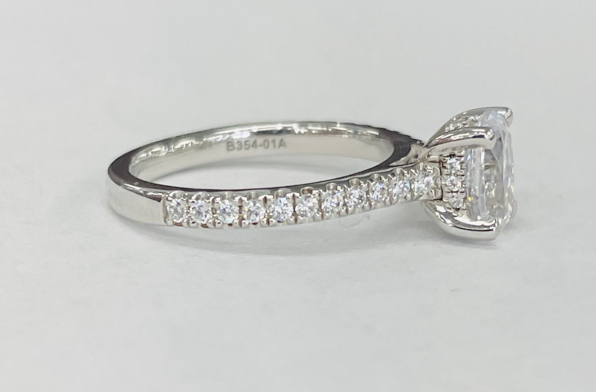 A modern style with a classic finish. Made out of white gold this ring features a four prong basket head with a hidden halo of round brilliant diamonds. Accented by even more round brilliant diamonds down the sides to give you even more sparkle. A setting she can truly wear forever.