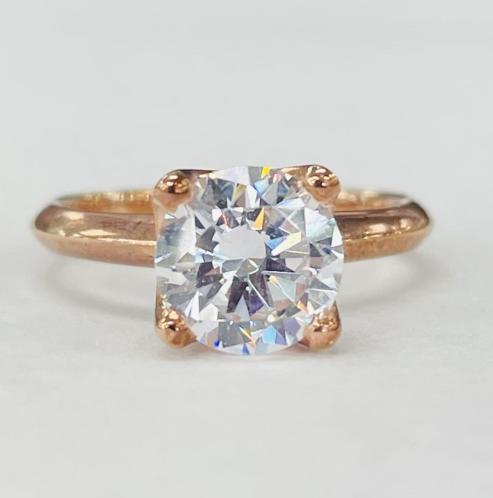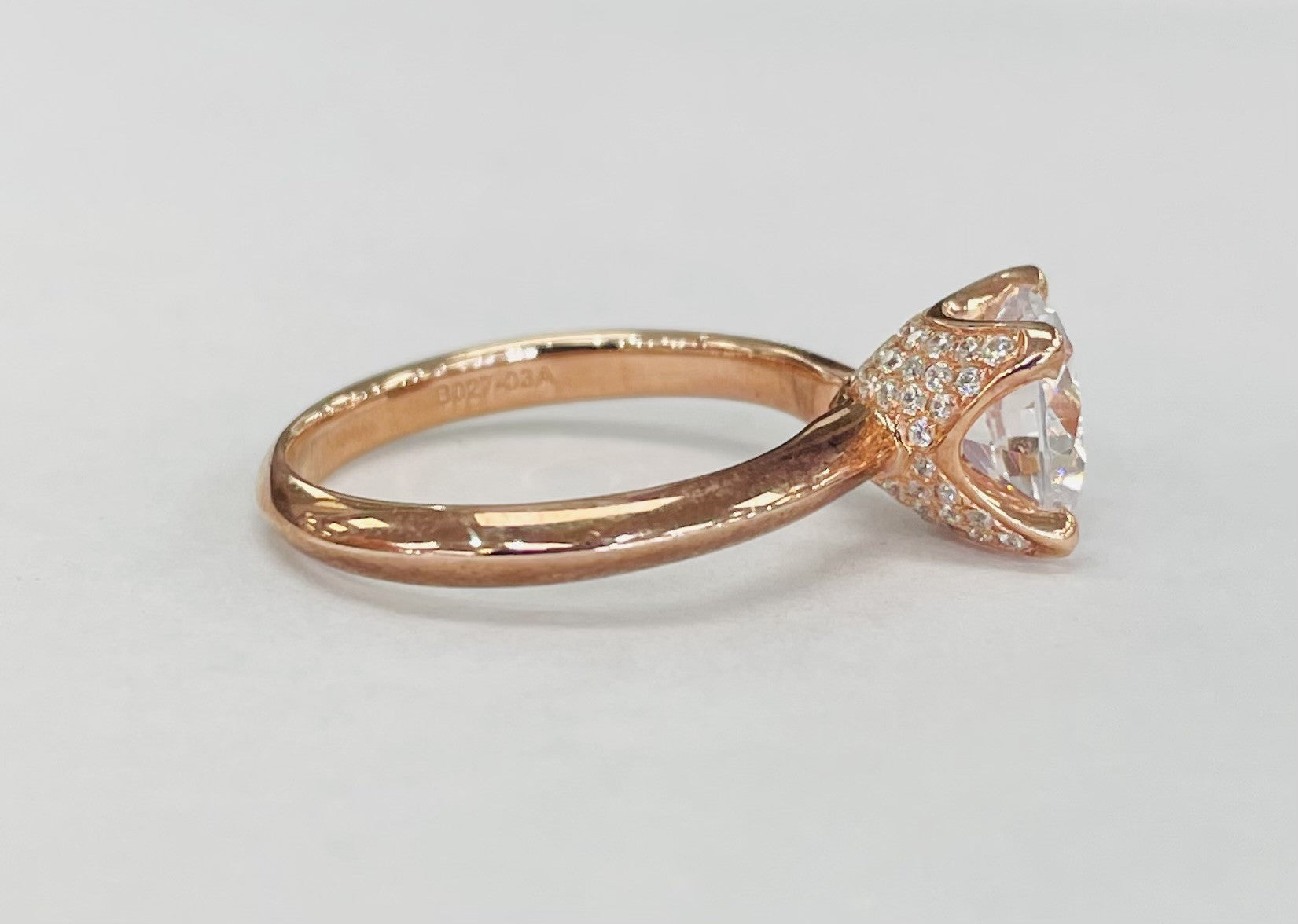A setting with a hidden secret. This rose gold ring features a simple setting with a plethra of diamonds on the head of the ring. Made to give that little bit of a suprise sparkle from the side.