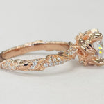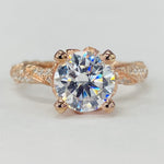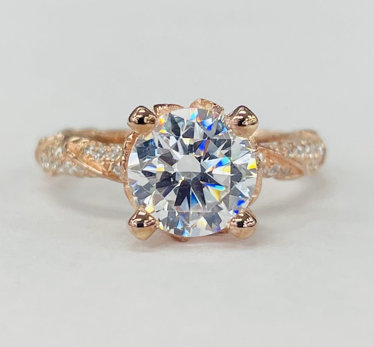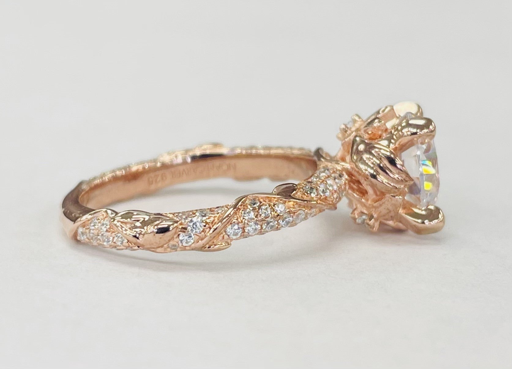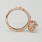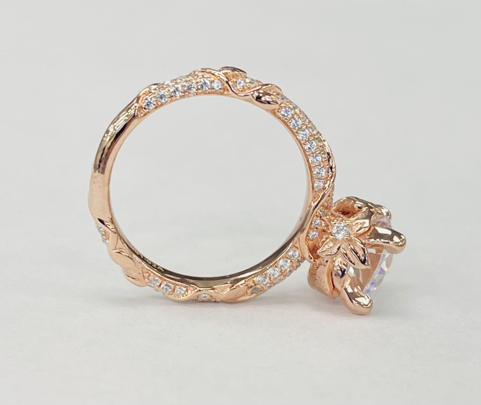 A magnificent setting that is perfect for any rose or flower lover. Made out of rose gold, this ring is made to mimic evetything about a rose. Featuring a beautiful shank pave set with diamonds and twisting vines. Accented by a stunning floral rose bud head for your center stone to fit perfectly into.