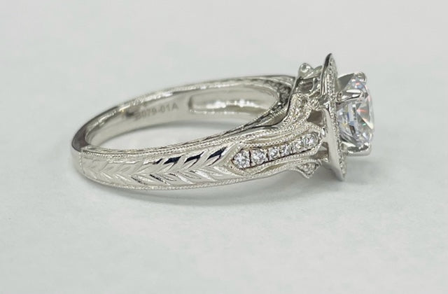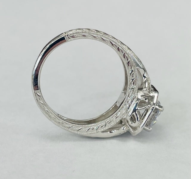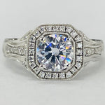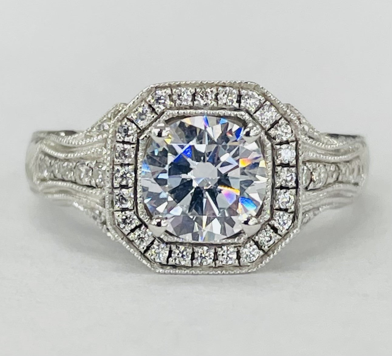 A setting that can be seen from across the room. Made out of white gold this stunning ring features an octangle diamond halo with even more diamonds down the sides of the shank. Accented by detailed engraving and millgrain to give that vintage feel and that wow factor.