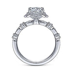 The Gabriel & Co. “Pietra” ER15229R4W44JJ engagement ring is a romantic vintage-inspired design crafted in 14K white gold. A round brilliant center stone is framed by a distinctive fancy halo of pavé-set diamonds, magnifying its brilliance with heirloom charm. Intricate milgrain detailing and graceful scrollwork along the shank add artistry and sophistication. With approximately 0.40–0.45 carats of accent diamonds, Pietra blends timeless elegance with vintage glamour. Fully customizable in metal type and center stone size, this ring is a versatile and enduring symbol of love.