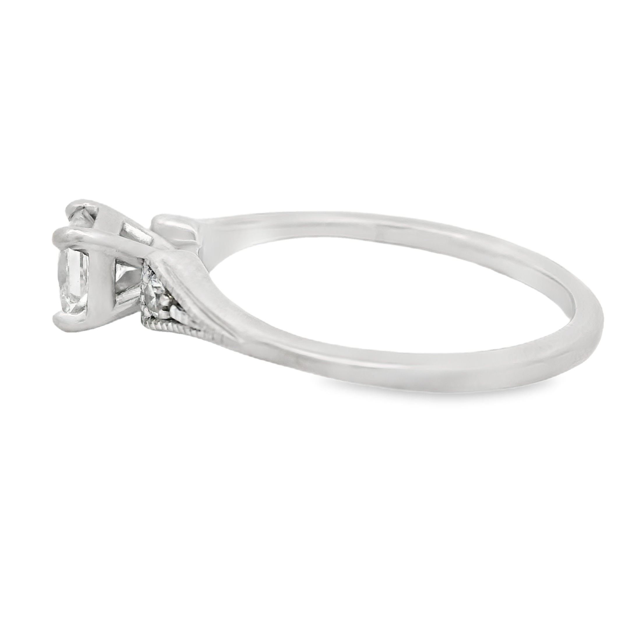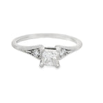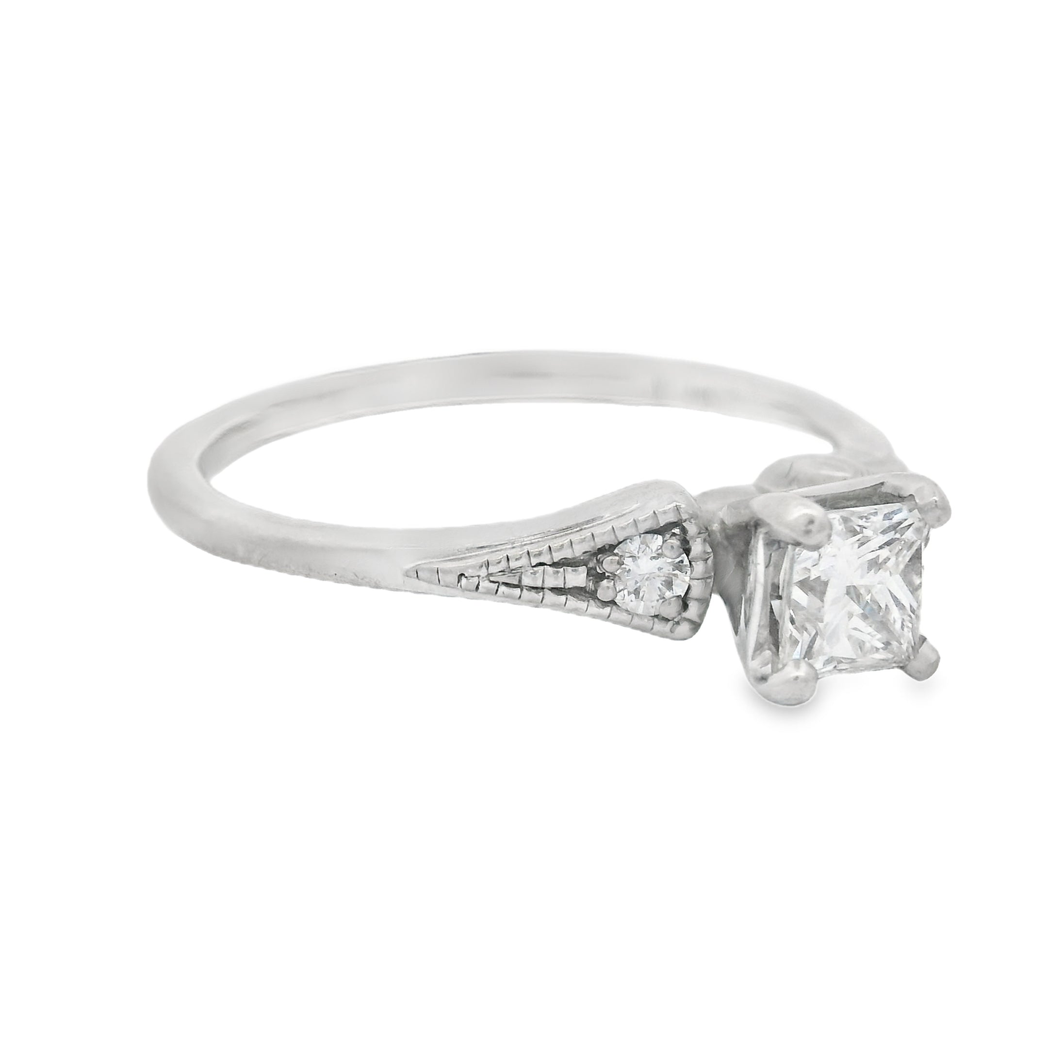 One of the simpliest but most amazing rings you can ever get your hands on. Made out of white to compliment the diamonds, made dainty to show its elegance, and have a old school vintage feel to put all the trends into one. Featuring a VVS2/H Princess Cut diamond in the center to step the bar up even higher! Accented by two mini round brilliant diamonds this ring is truly a masterpiece!