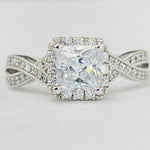 A dazzling white gold woven shank setting. Featuring a small halo around your center stone with round brilliant diamonds. Accented by a pave set woven band with millgrain.
