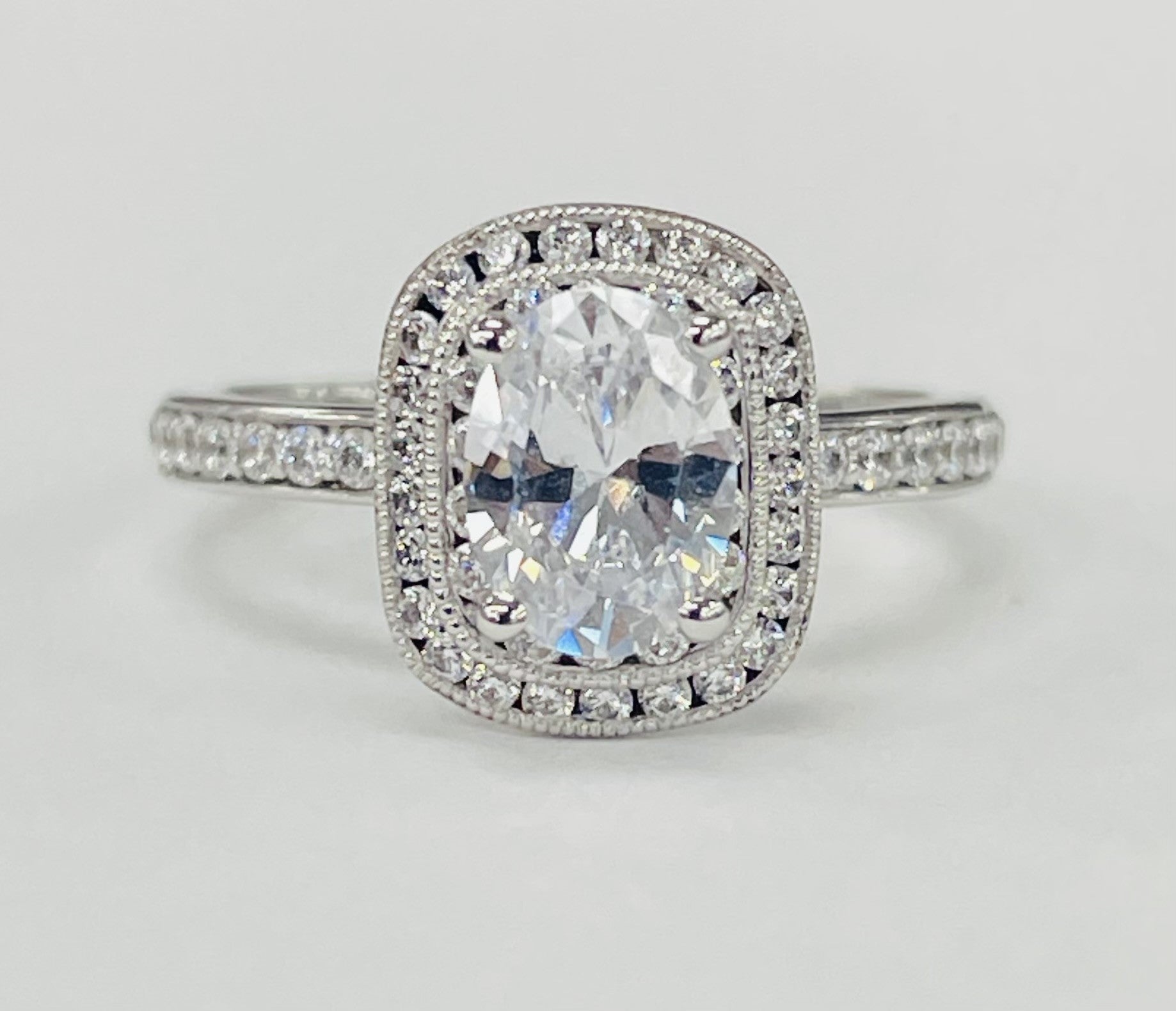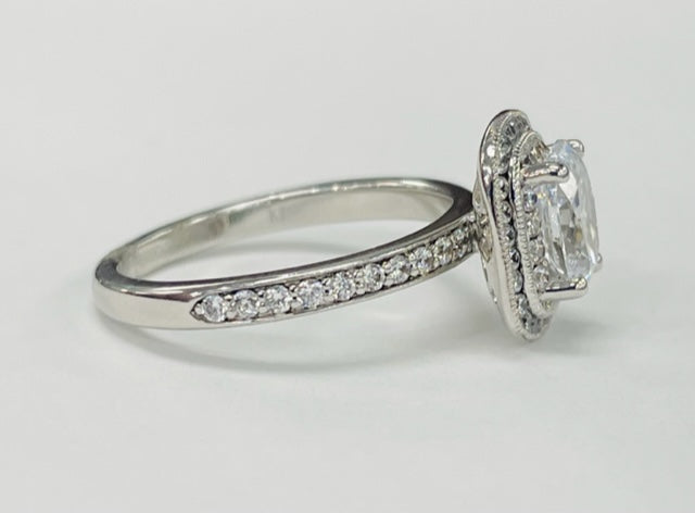 A beautiful channel set halo diamond setting. Made out of white gold and featuring a channel set diamond halo with millgrain. Accented by even more diamonds channel set on the shank.