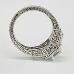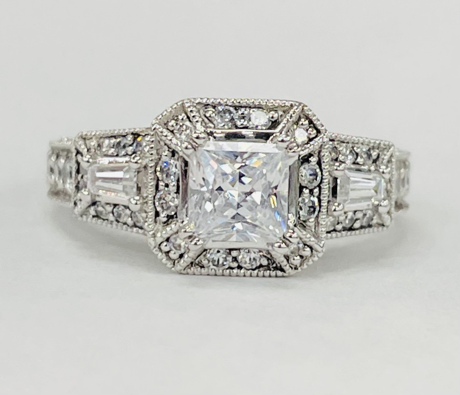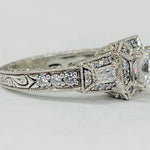 A stunning three stone vintage inspired setting. Featuring two larger baghuettes on the seide to compliment your center stone. Accented by three halos with shared prong round brilliant diamonds and millgrain. Detailed With filigree on the sides of the shank this ring pay homage to the details of old.
