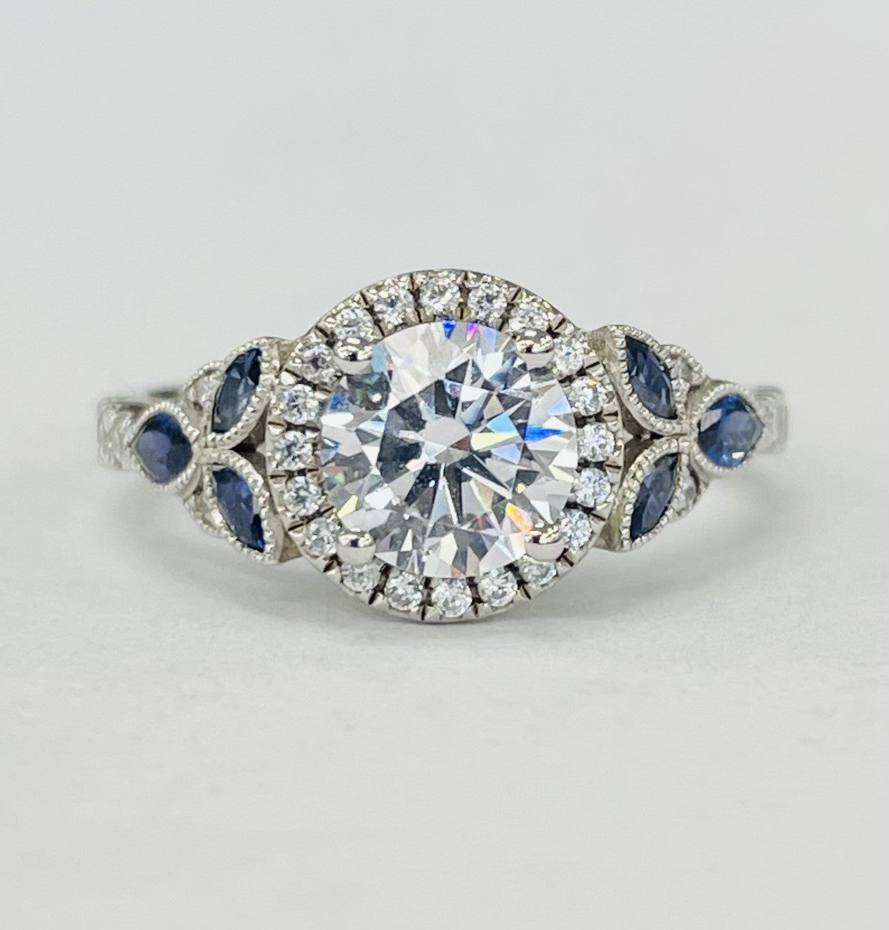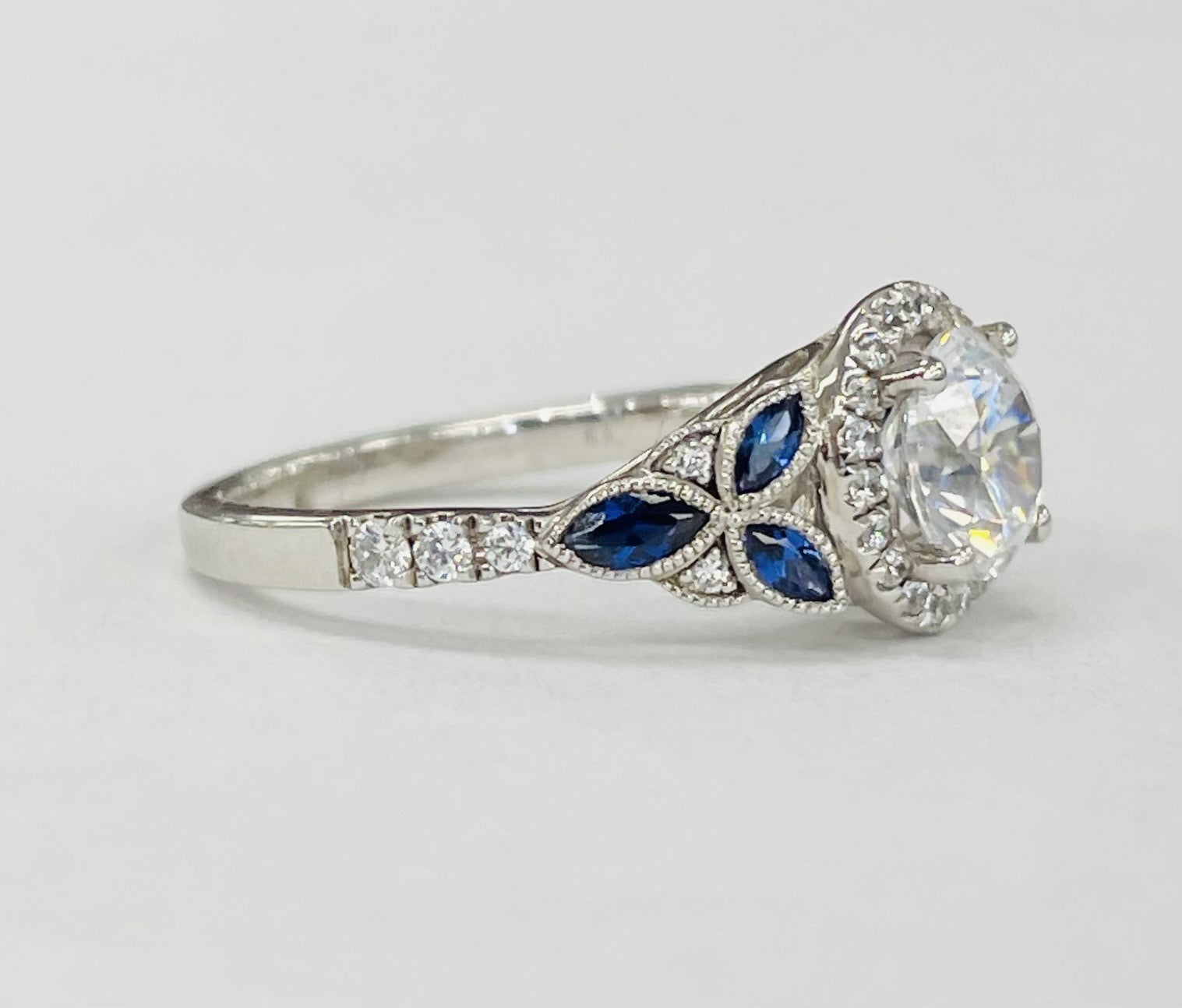A stunning floral design setting with a splash of color. Feature a micro halo of diamonds to add more bling to your center stone. Accented by a floral style shank with sapphires cut at leafs with detailed millgrain and floral design.