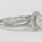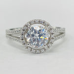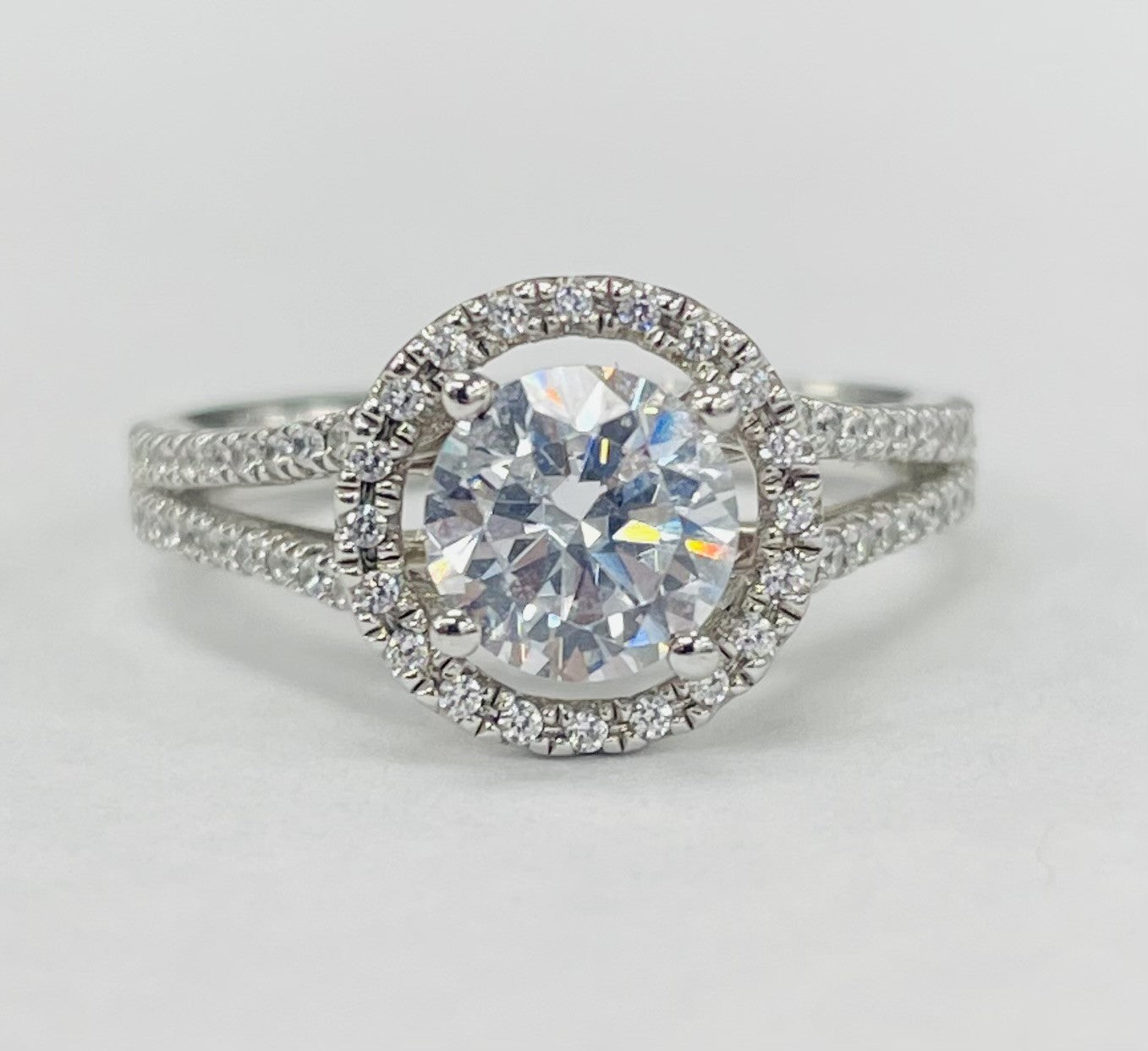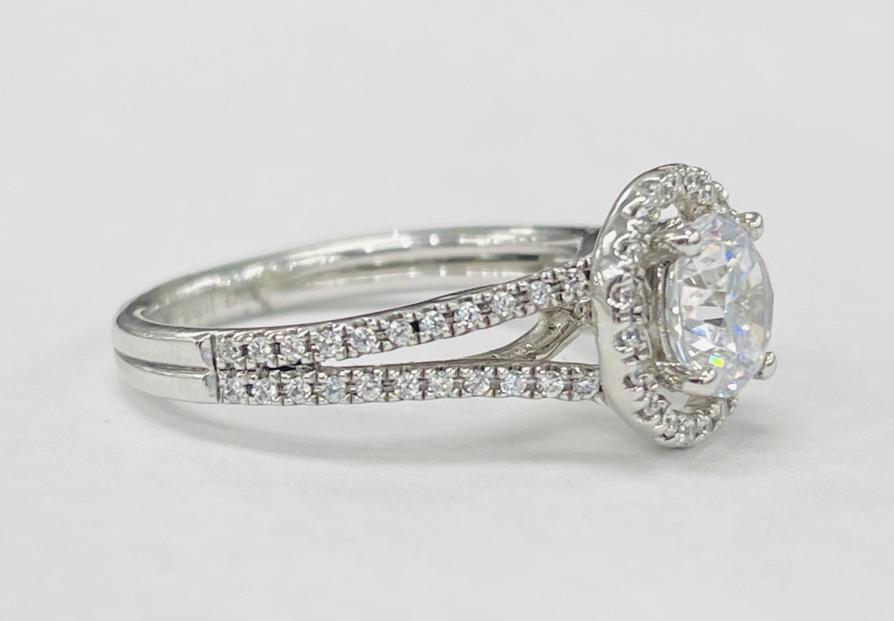 A true modern setting. This setting features a halo with space inbetween your center stone for contrast and mroe light to shine through. Accented by a split shank with pave set diamonds.