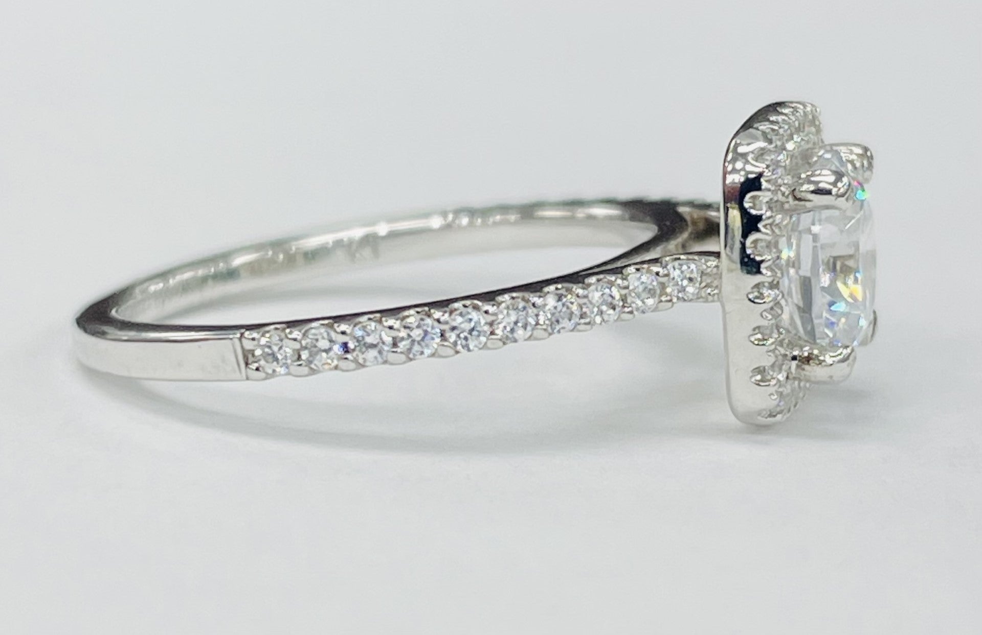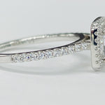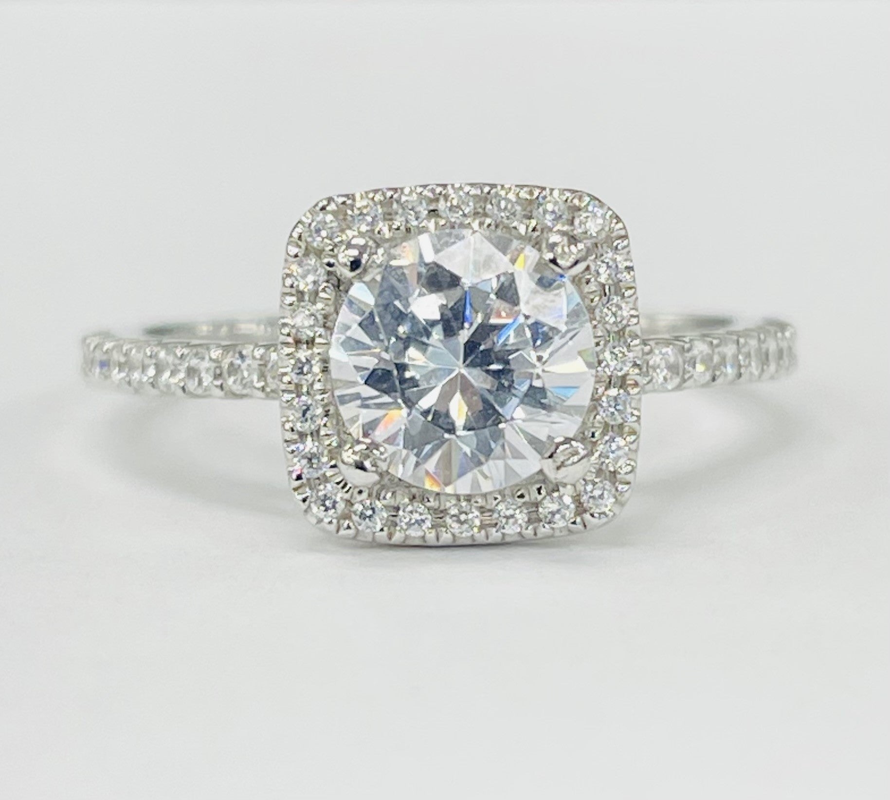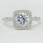A simple halo diamond setting. Made out of white gold and featuring a cushion style halo. With all micro pave diamonds on the halo and sides.
