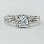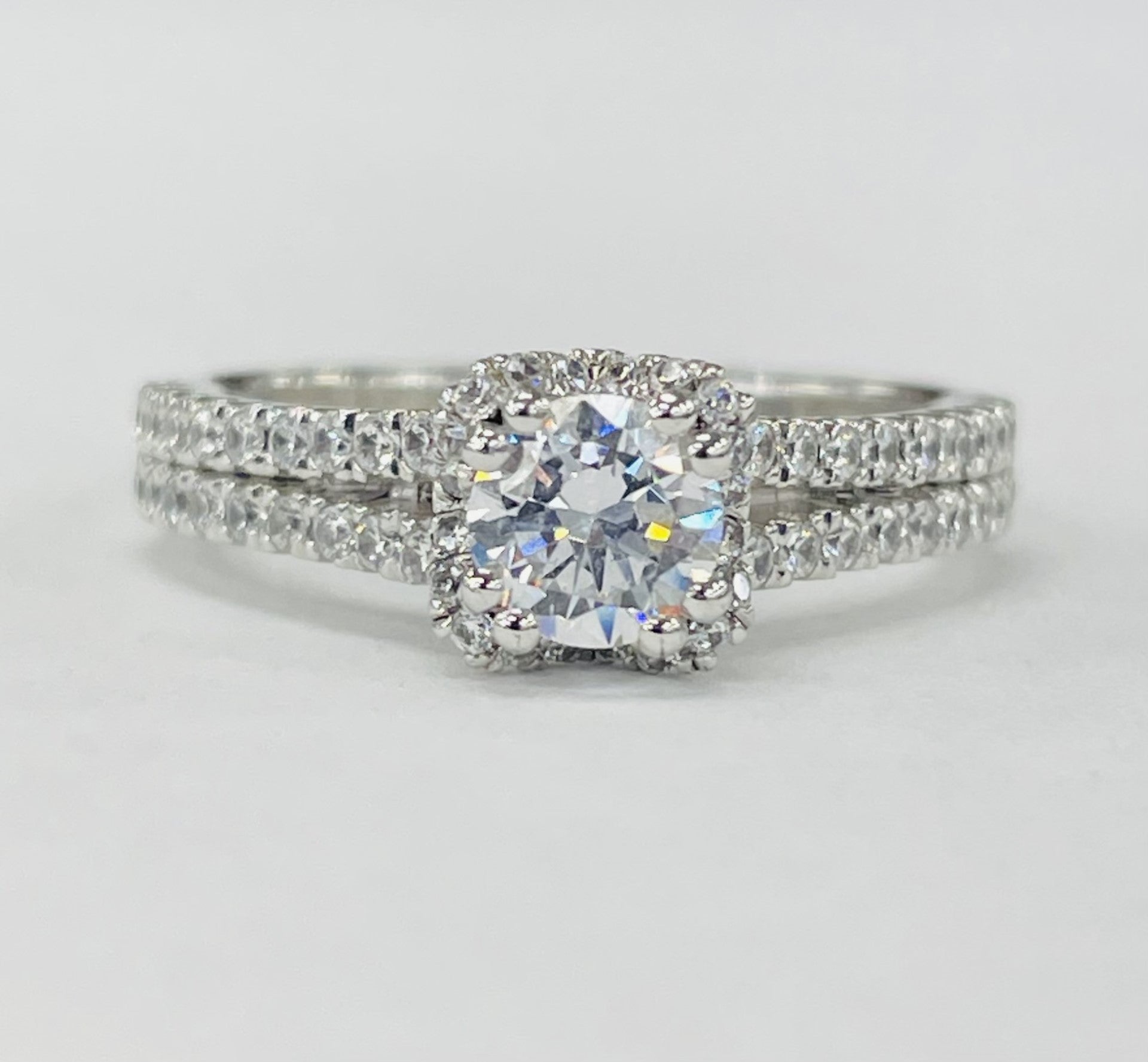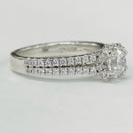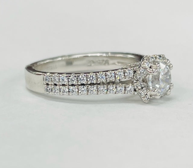 A split shank halo diamond setting. Made out of white gold with a unique halo accented by round brilliant diamonds. Diamonds down the side of the shank and even more on the undercarriage,this ring is amde to shine.