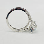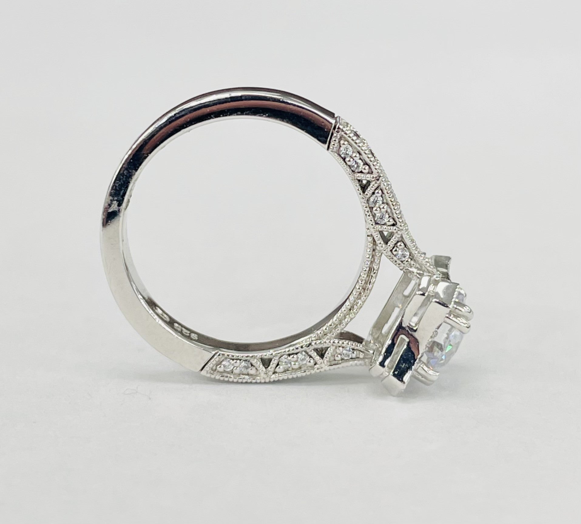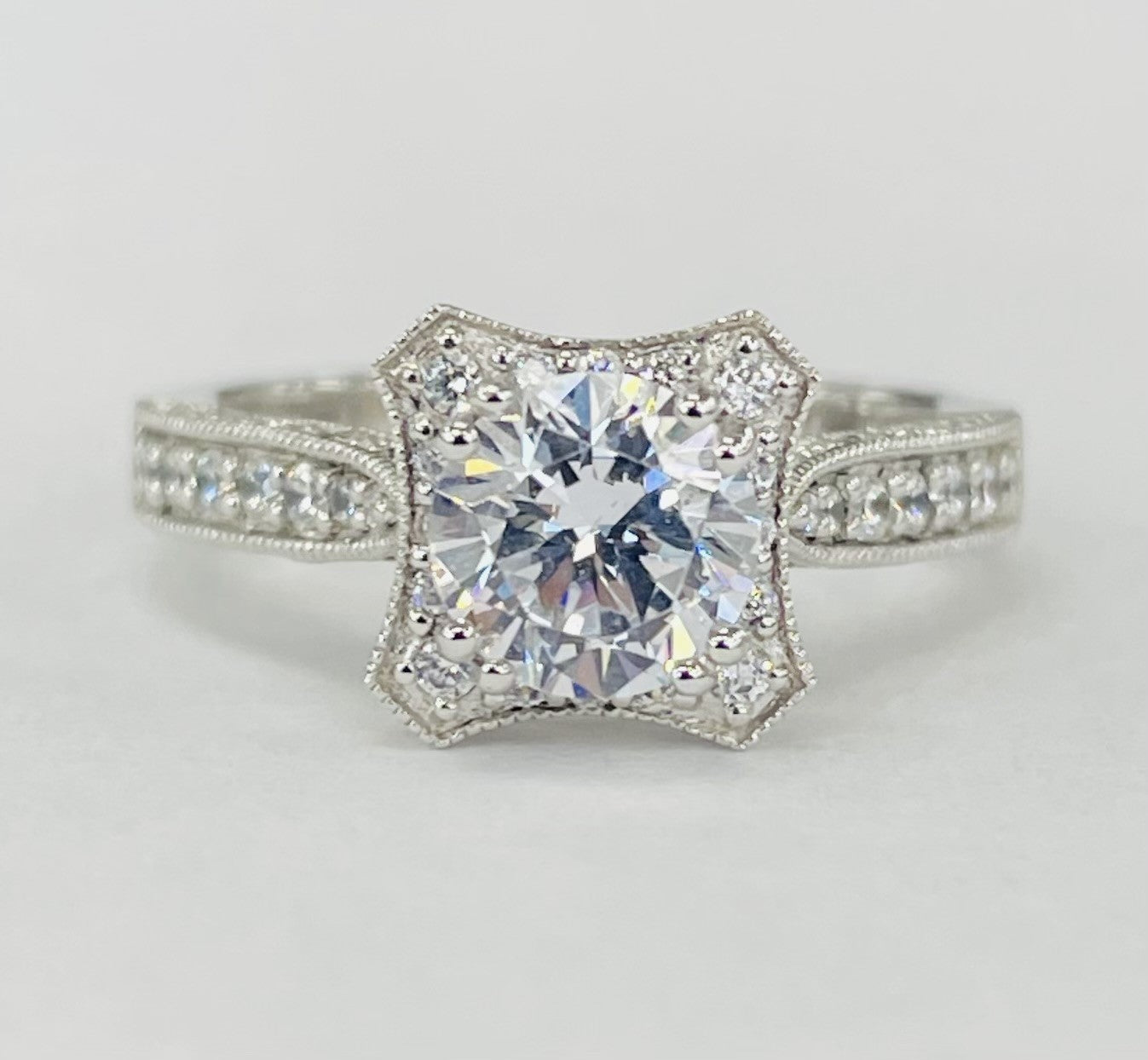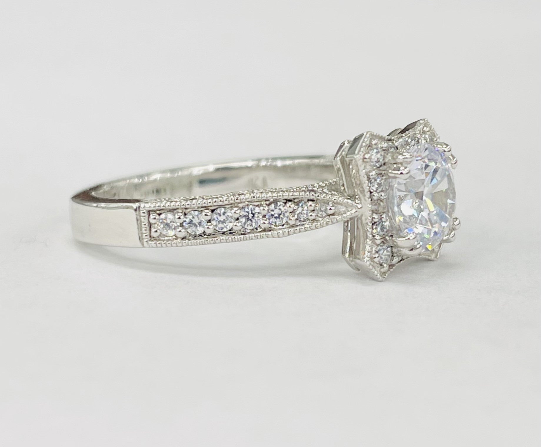 A vintage inspired setting with alot of detail. Made out of white gold and featuring a unique halo with shared prong round brilliant diamonds and millgrain. Accented by more round brilliant diamonds and detailed filigree. A true ring that shows her love of vintage style jewelry.