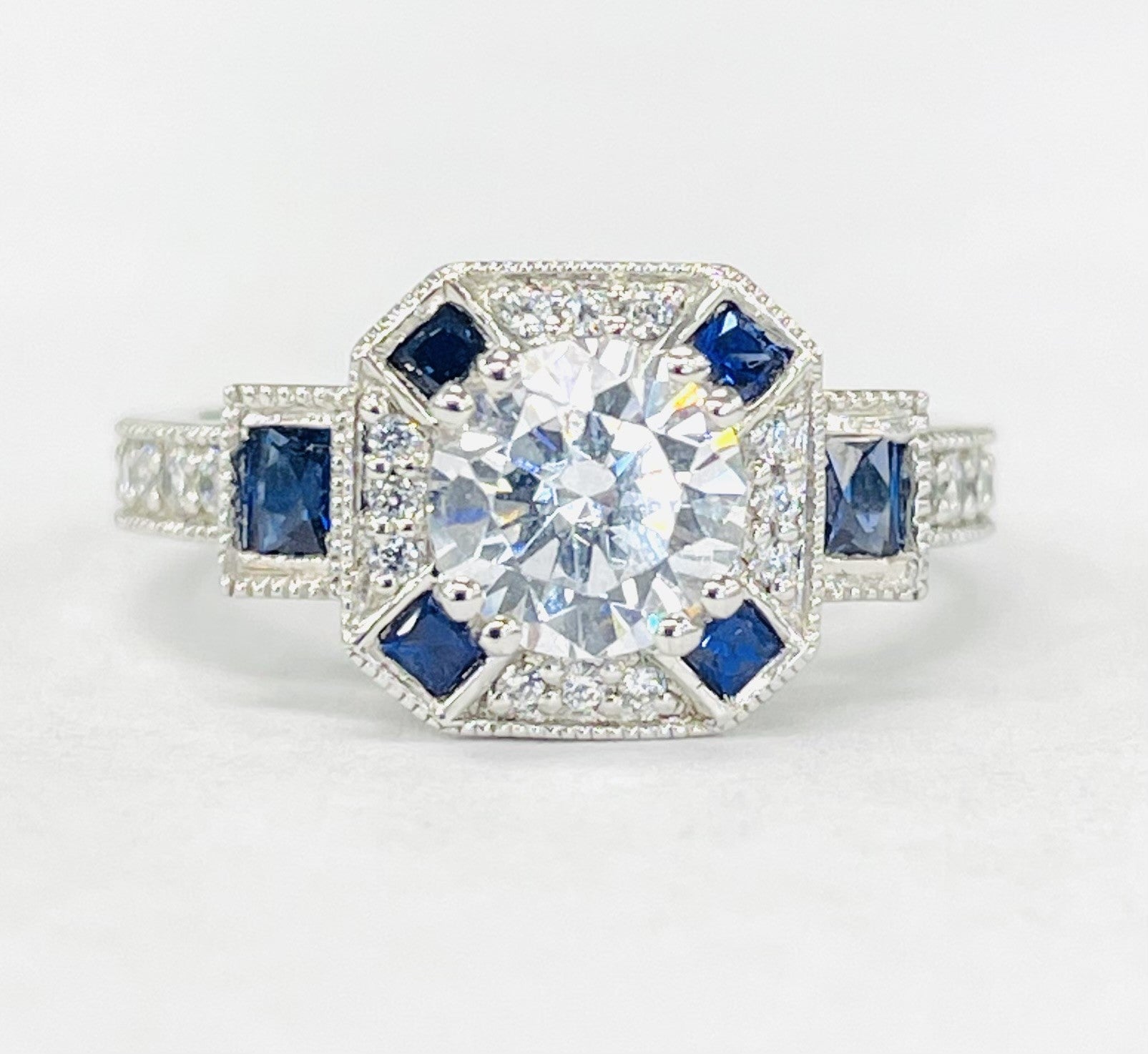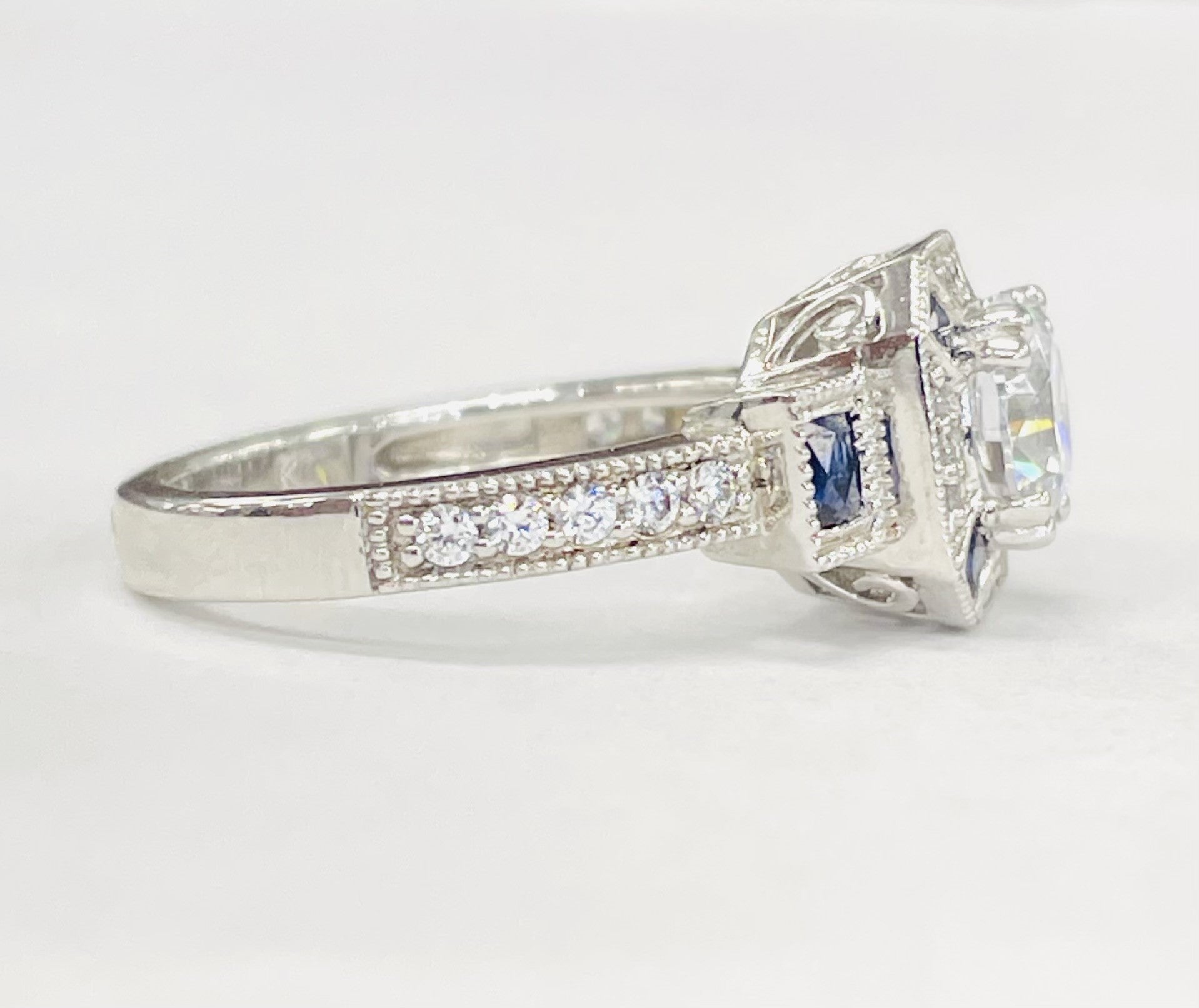 A detailed vintage inspired halo sapphire and diamond setting. A staple in the romance location, this ring features a unique and one of a kind halo with sapphires and diamonds. Accented by sapphires on the side, round brilliant diamonds, and millgrain all over. A truly magnificent setting.