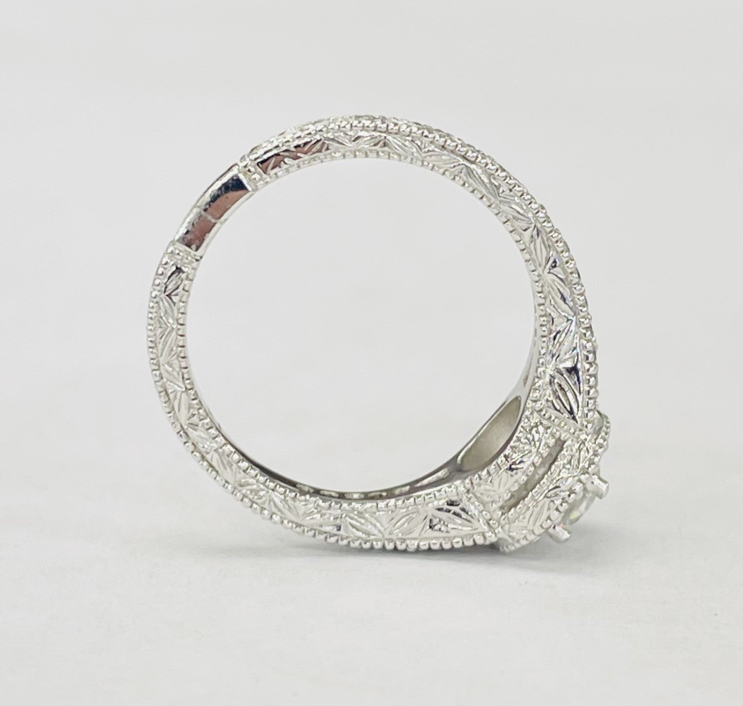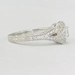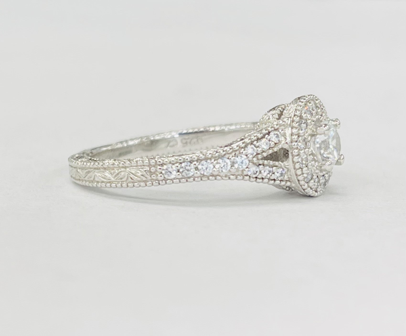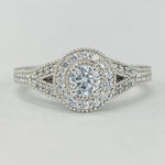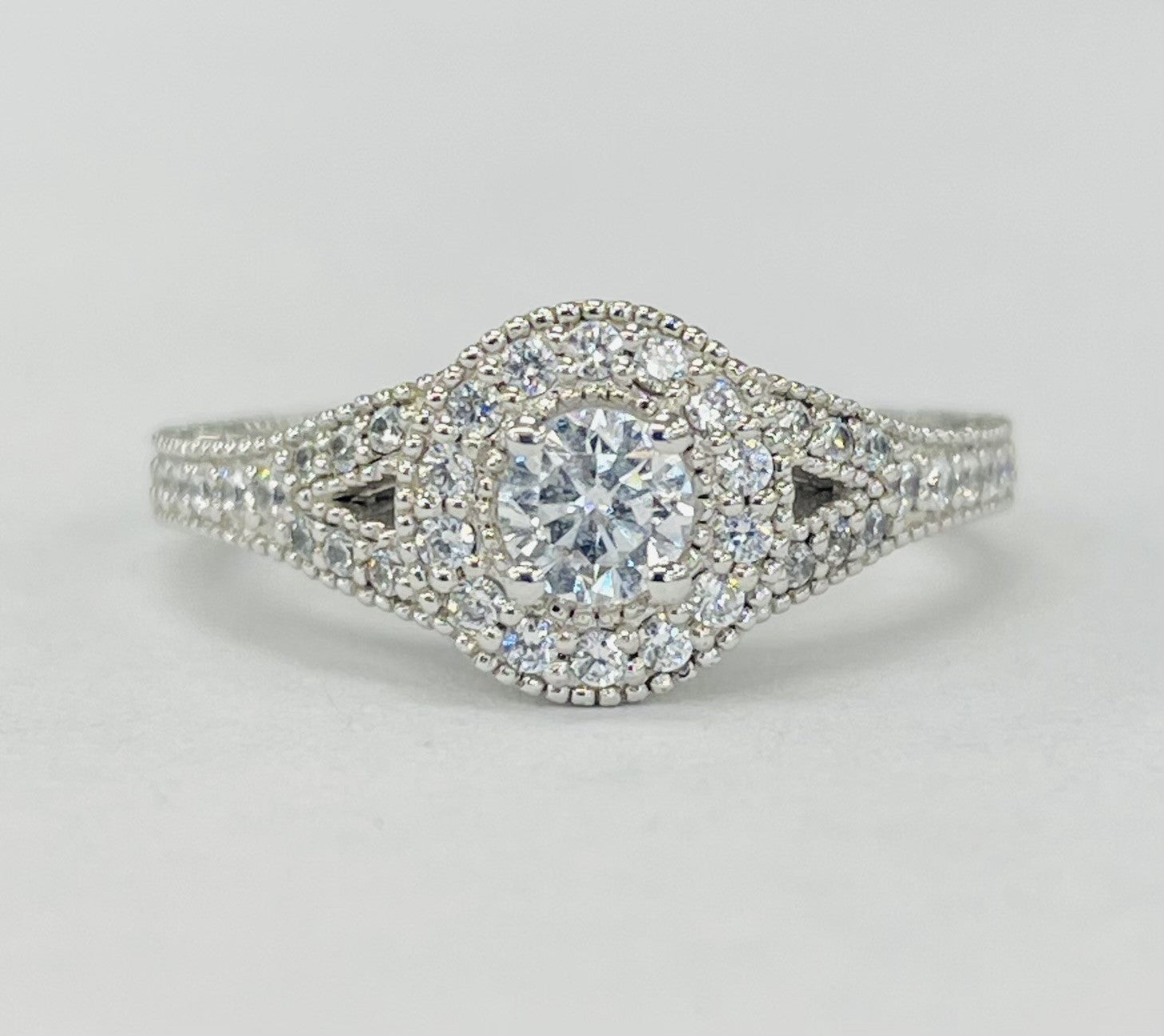 A vintage inspired split V setting. Made out of white gold and featuring a stunning ammount of detail and a halo. Accented by round brilliant diamonds all around.