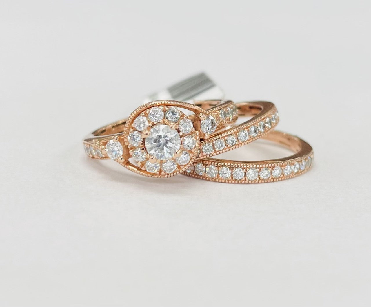 Look no further then right here! Made with your time in mind this stunning set not only includes a stunning engagement ring but also two wedding bands! Made out of rose gold to make the diamonds pop and millgrain to accent this breath taking set, it is truly something to be seen!